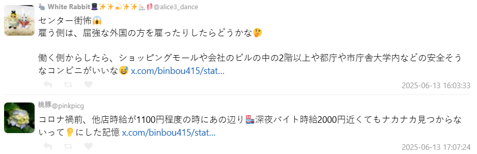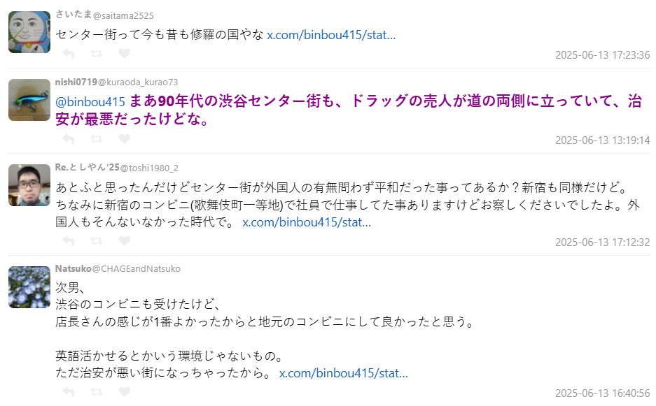 多位過去曾在當地工作或生活的網友也分享經驗:「以前在新宿便利商店當正職,那時候就已經很可怕,還沒這麼多外國人,現在只是狀況更誇張。」、「澀谷該地早在 90 年代就有毒販橫行,治安從來沒好過」、「疫情前澀谷深夜便利商店即使開出時薪兩千日圓,也難以徵到人上班。」
