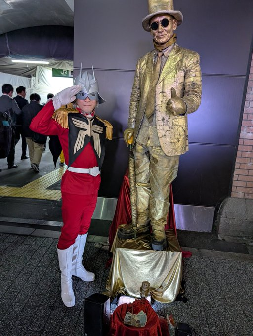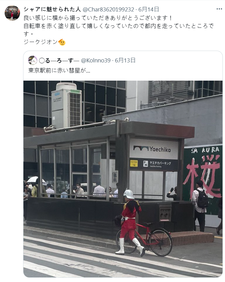 起因就是有網友在 X 上貼出,在東京車站附近看到了「紅色彗星」夏亞·阿茲納布爾,看著這全套紅色吉翁大佐戰袍加上頭盔,還牽著腳踏車的模樣,瞬間成為網友話題。
