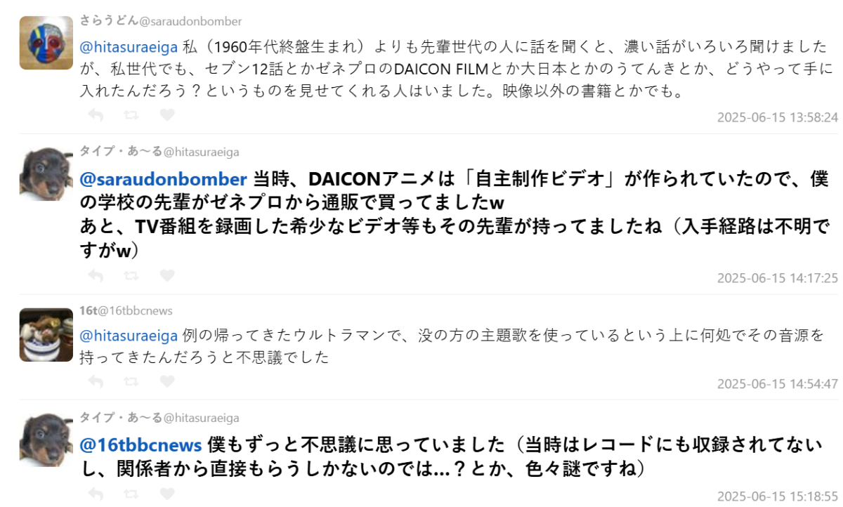 有網友分享,自己那一代(1960年代末生)常常需要仰賴人脈,有遇過一些學長,手上有《超人七號》第12集錄影帶、同人特攝 DAICON FILM 動畫,甚至是從未商業發行過的罕見作品。另一位網友也補充,學長甚至能直接從動畫製作公司 GENERAL PRODUCTS(GAINAX的前身)訂購同人影帶,令人驚嘆情報來源之神秘。