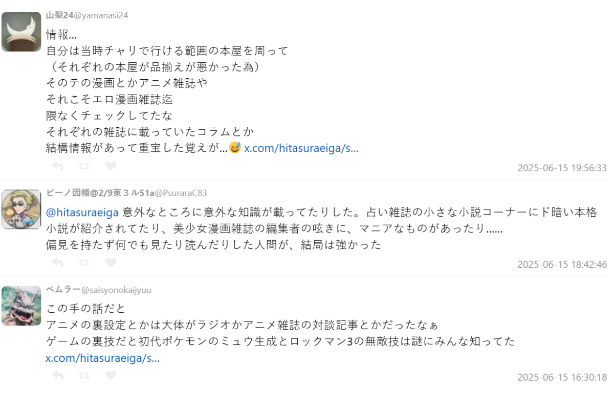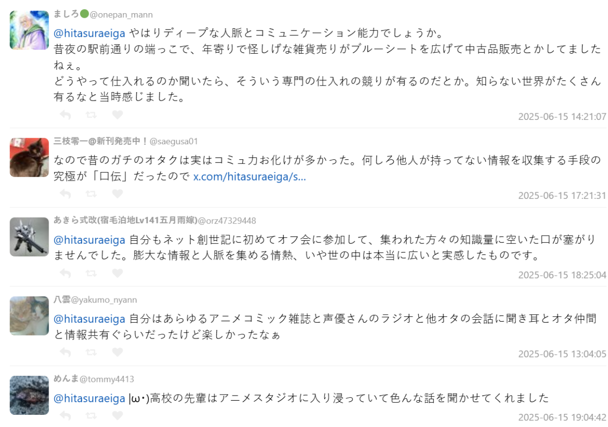 之所以會有這樣的討論,是因為有名推主タイプ・あ~る ( @hitasuraeiga ) 發文提問:「大家說以前找情報很困難,但那時候其實也有很多人不知道怎麼搞來這些資料。像這樣的人,當時才是真正被叫做『御宅』。」,這段話立刻引起大量網友共鳴與補充,串起一段日本宅文化的「考古記錄」。