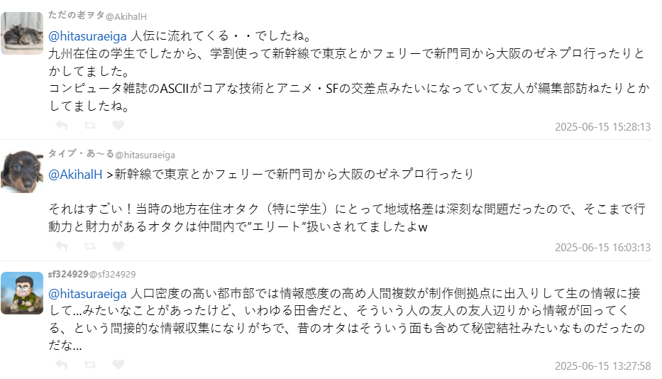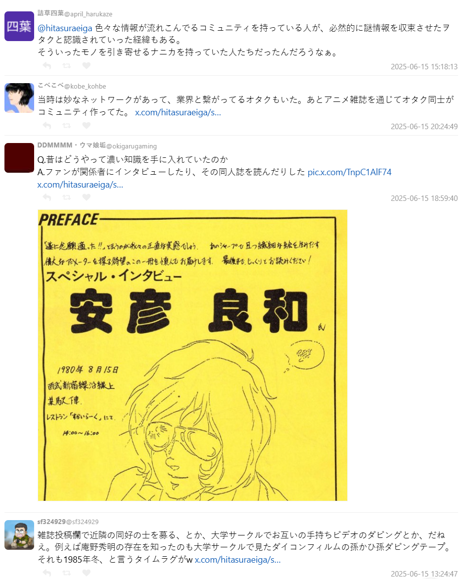 討論中也有許多網友指出,當時「擁有大量情報來源的宅」往往就是圈內人公認的「核心人物」,成為一個聚落。他們會組社團、辦同人誌、舉辦放映會,甚至親自採訪創作者,把第一手內容寫成出版物。