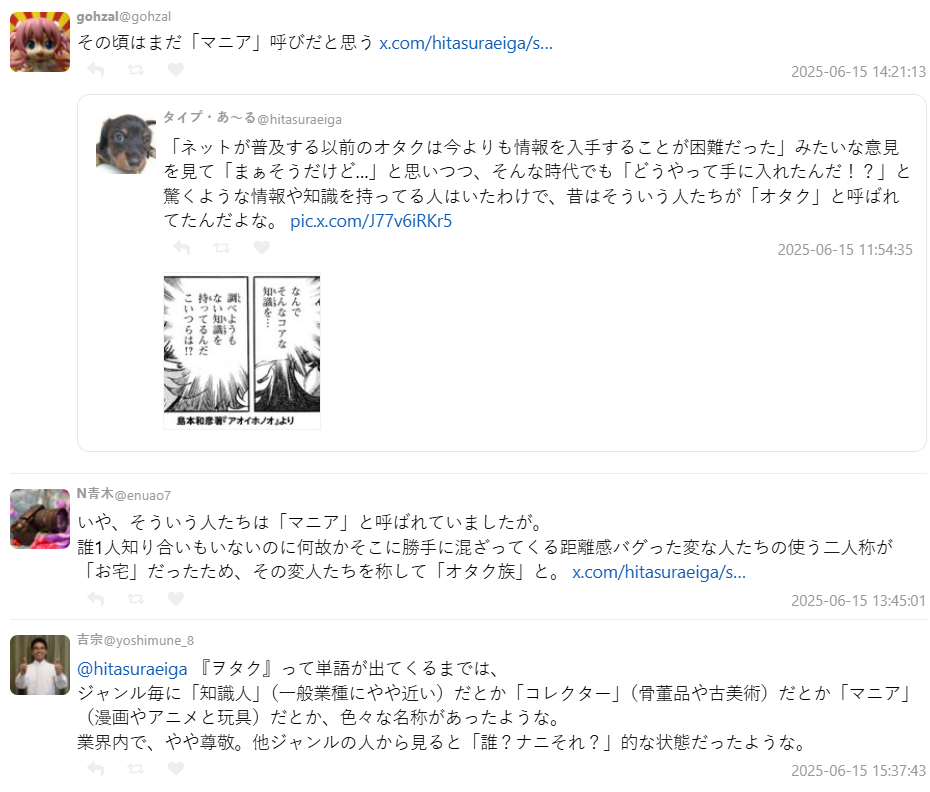 不少人也回憶,當時這類人被稱為「マニア」(狂熱者)、「收集家」、「知識人」等不同稱呼,那時候「御宅族」的詞彙都還沒出現。後來才逐漸以「御宅族」統稱所有深度涉獵者。而在大眾還不懂次文化的年代,他們有時被視為奇人,但在圈內卻是敬畏與崇拜的對象。
