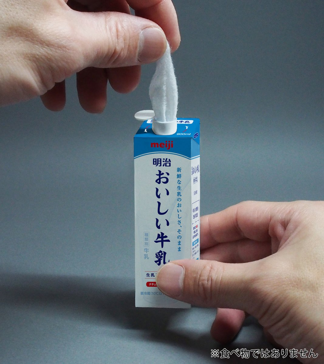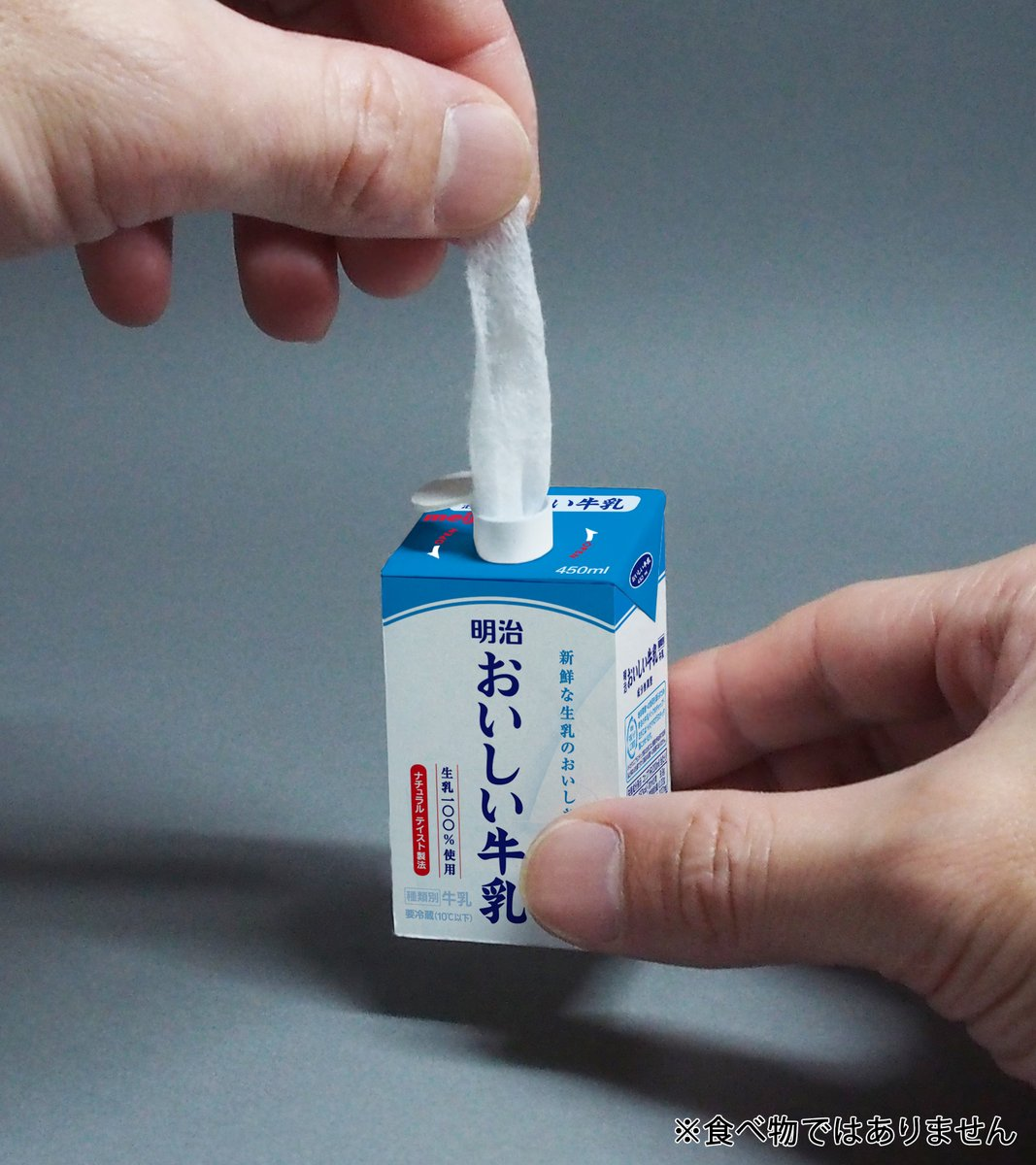 這次跟日本非常有名的創意商品概念設計師ミチル(@mitiruxxx)合作,這項以「明治おいしい牛乳」為盒裝設計,依比例縮放的濕紙巾盒,就從倒出牛奶的旋蓋上抽出,造型方便可愛,收藏在包包裡更是方便有趣。