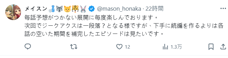 由於下週第十二話就是最終回了,雖然還沒播,也已經有不少粉絲敲碗希望可以補上續篇或是外傳故事,希望能讓更多角色劇情可以更完整,畢竟真的十二話對鋼彈電視動畫來說真的是最少的...。
