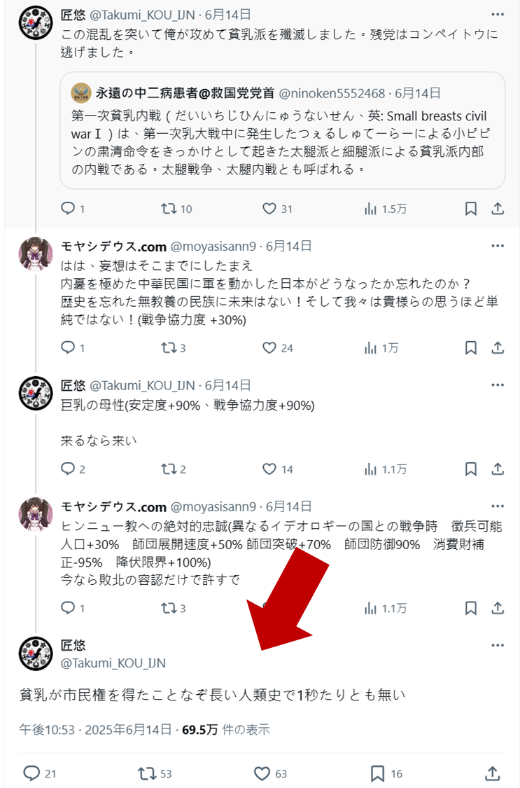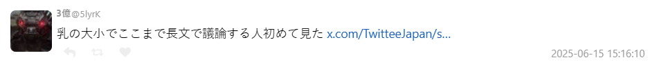 就是這則在 X 上的胸部審美觀討論,關於討論「巨乳」跟「貧乳」之際,有位推主突然開大絕直喊 : 「在人類這麼長的歷史裡,貧乳從來沒有哪怕一秒鐘是被社會認可的。」