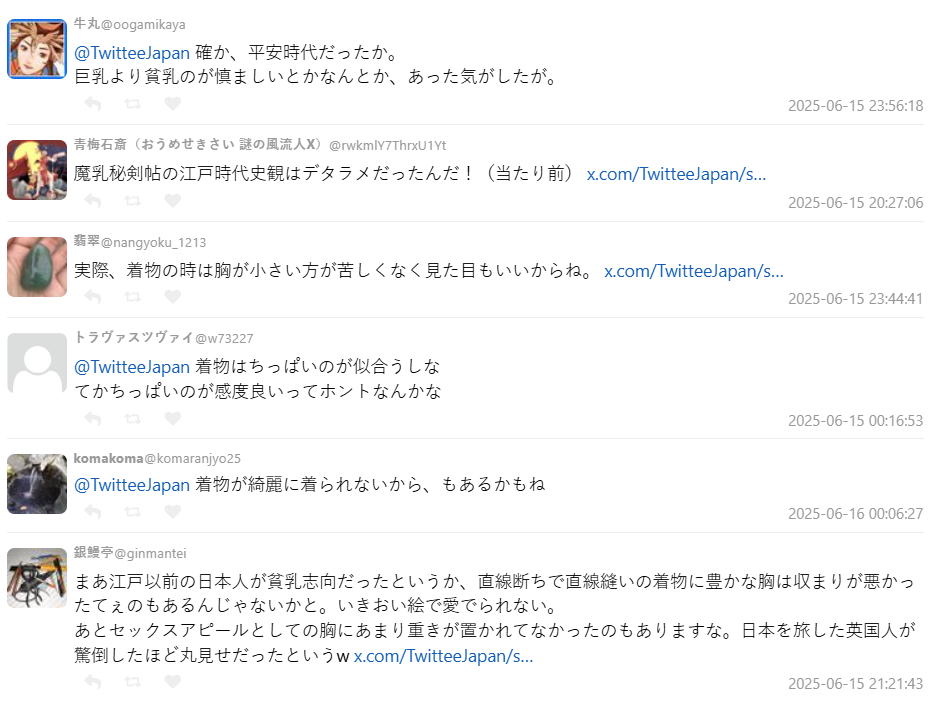 也有網友開玩笑說 : 「江戶時代的貧乳文化真的存在耶,不是漫畫《魔乳秘劍帖》亂掰的(笑)」
