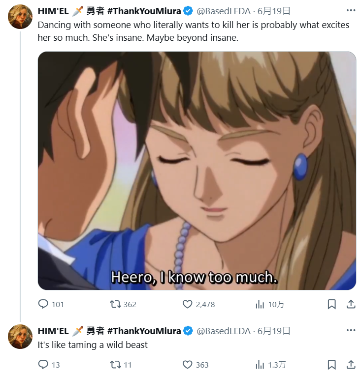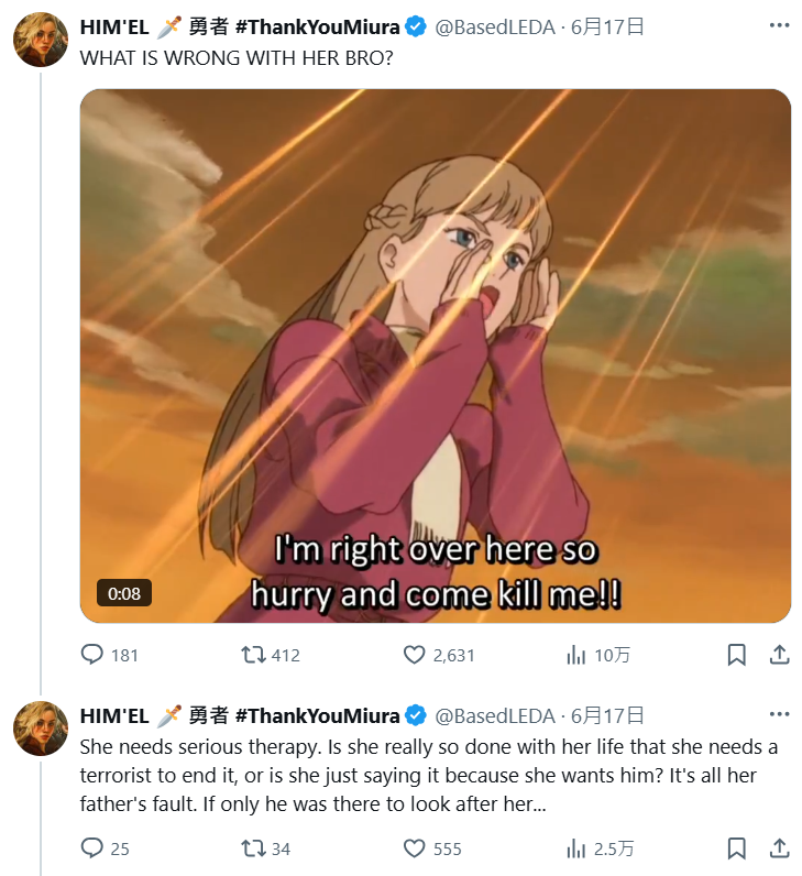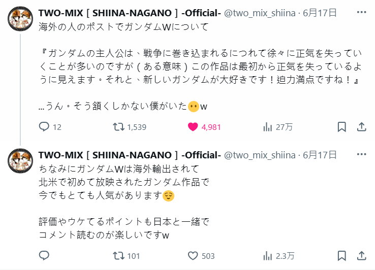 先前介紹過,海外推主 HIM'EL ( @BasedLEDA ) 因為觀看《機動戰士鋼彈0083:星塵回憶》煞到妮娜劇情卻讓他崩潰,成為日本與海外網友關注的紅人。近期他也看了《新機動戰記鋼彈W》,對於主角希洛·唯還有莉莉娜·匹斯克拉福特的評價獲得不少網友認同,甚至連演唱主題曲的 TWO-MIX 永野椎菜都對此認同,成為熱議話題。