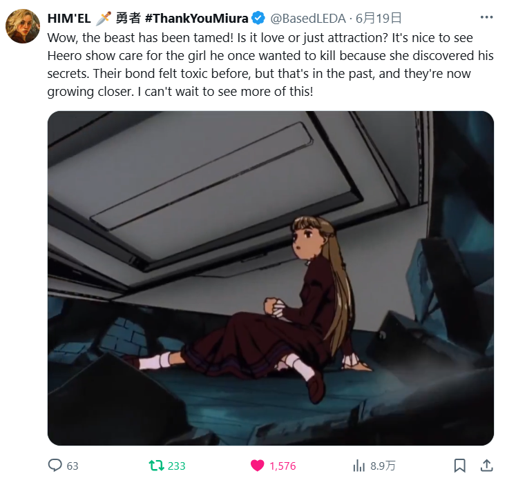 這段評價不僅受到日本與海外網友關注,甚至連演唱主題曲的 TWO-MIX 永野椎菜都在 X 發文表示 :