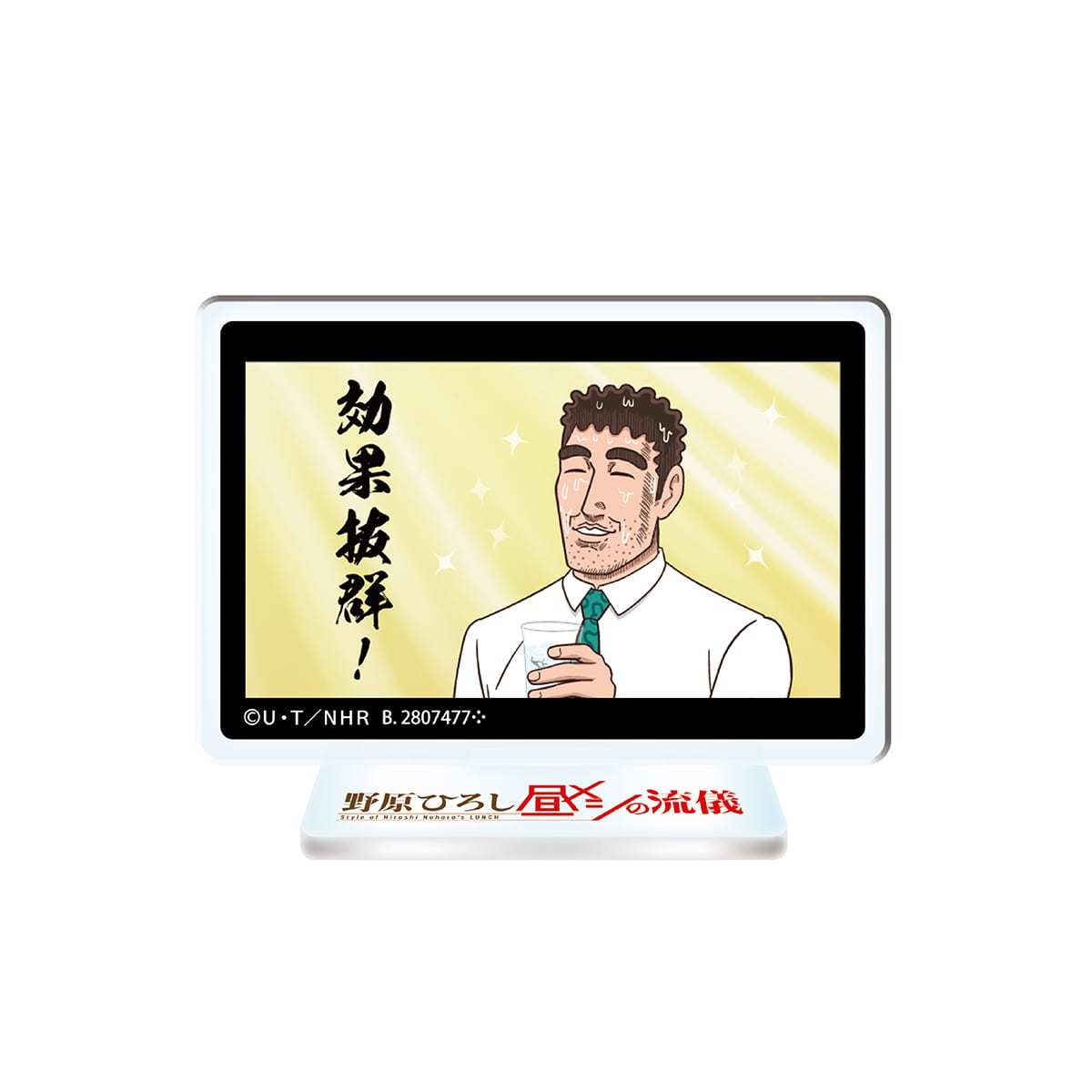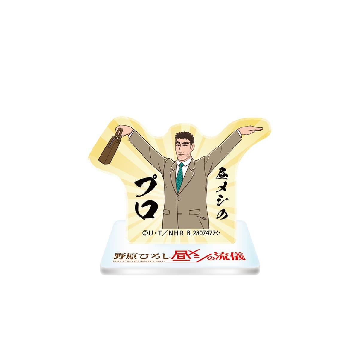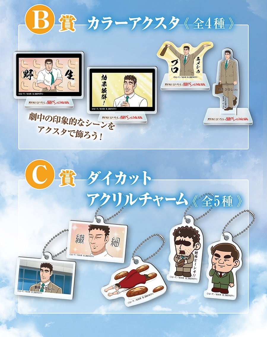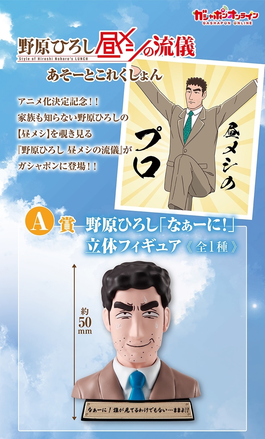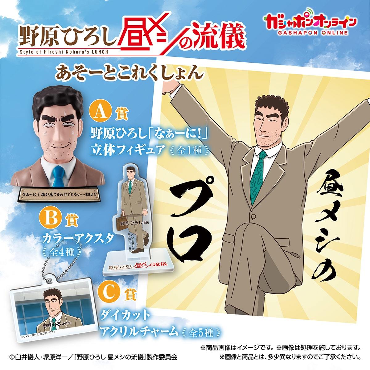 本次的「野原廣志午餐的流派 隨機收藏」轉蛋是為紀念動畫化推出的商品,以賞品的形式提供 A、B、C 三種不同級別的獎項,其中 A 賞為廣志的立體模型,參考的是漫畫第三話中廣志決定要趁勢多吃一點平常部不會點的東西的時候的表情,並在底座印有台詞的「什麼嘛!反正沒有人在看,管他的!」,詭異表情的名場面立體化實在是相當的有趣!