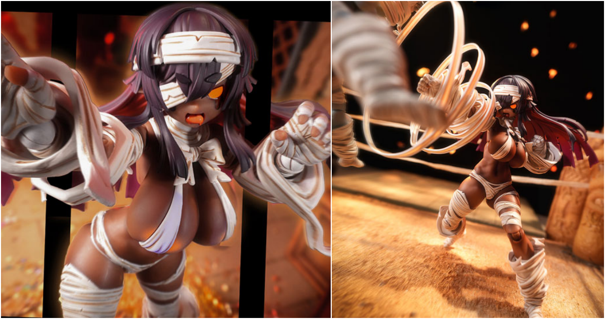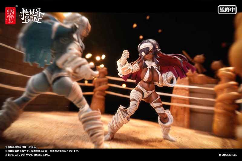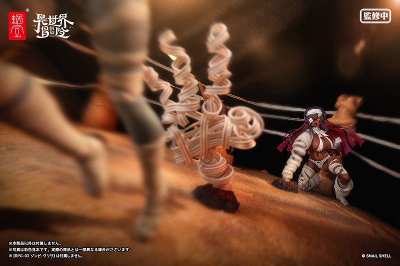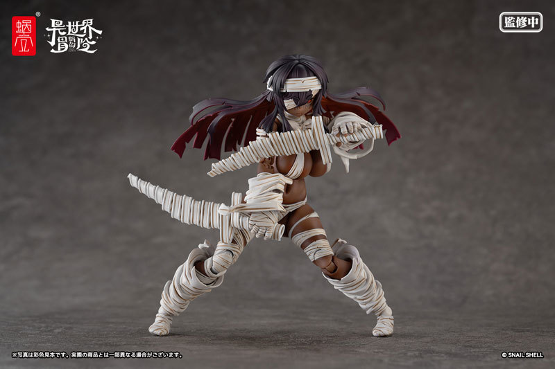 《蝸的異世界冒險》系列「復甦者-格莉莎 [ALTER]」1/12 比例可動人偶,以異色版本再登場!採用大肉感的可動素體,還原了原畫中豐滿的身材曲線,原本藍灰色的膚色這次換上了黑肉塗裝;頭髮內側使用紅色漸層塗裝,呈現出黑色系的魅力。身上綑綁的繃帶更是施以擬真的塗裝和刻痕細節,表現出細緻的層次!