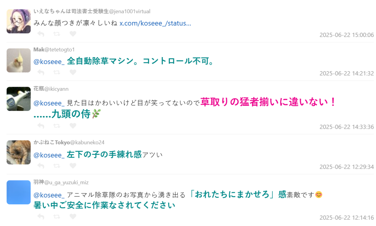引起熱議的推主八月(@koseee_)Po 文表示: 「這自從加入町內會以來,這是我聽過最猛的消息!」,沒想到社區居然找來共九頭山羊來幫忙除草,還附上照片,看起來這些隊員都超級給力的,讓他感到興奮又有趣。