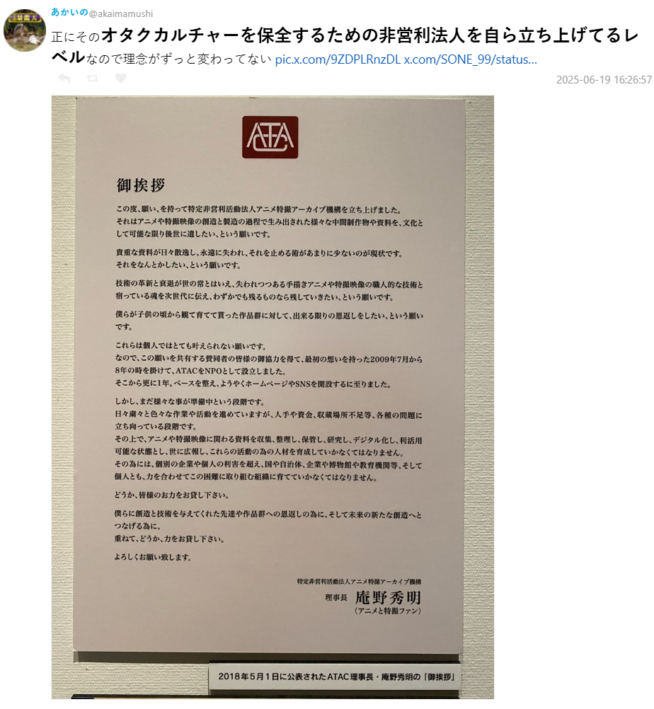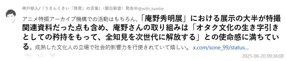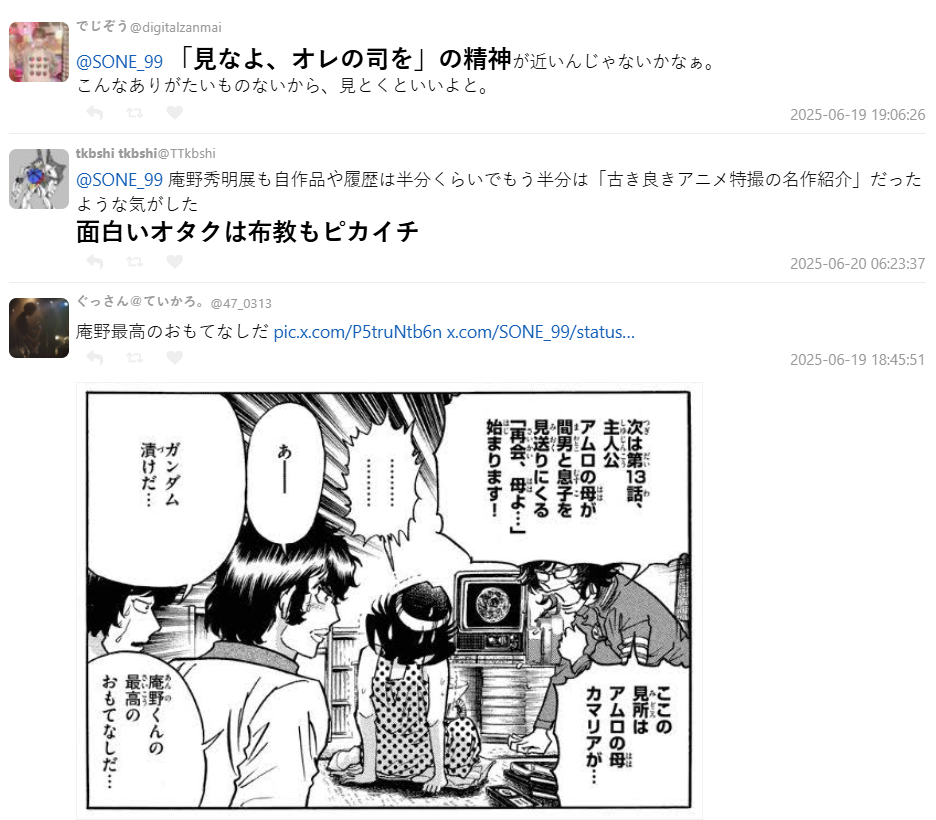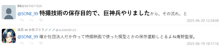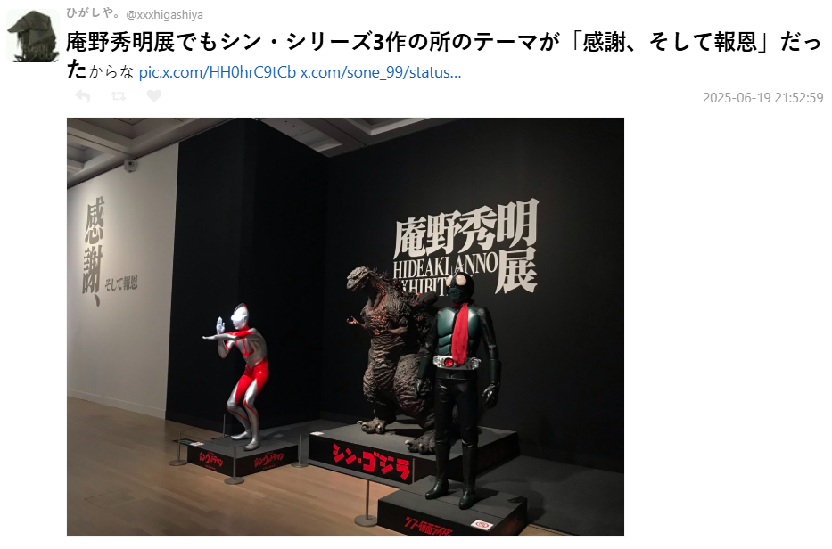 有網友指出,在先前舉辦的「庵野秀明展」中,也能感受到他對過去特攝文化的致敬與感謝,展覽的主題就定為「感謝,然後報恩」。還有粉絲發現,庵野甚至自己設立了非營利法人,專門保存與特攝有關的資料與模型,理念始終如一。