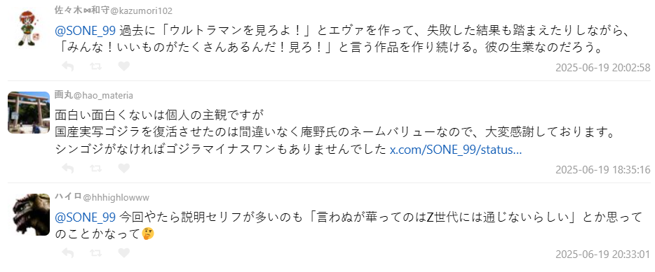 也有網友認為,庵野秀明《正宗哥吉拉》的成功讓國產特攝哥吉拉系列復活,如果沒有這部作品,也許《哥吉拉-1.0》就不會出現。也有觀眾注意到庵野近期作品中解說台詞變多,猜測他可能是認為「不說清楚Z世代聽不懂」,有意用更明確的方式進行知識傳承。