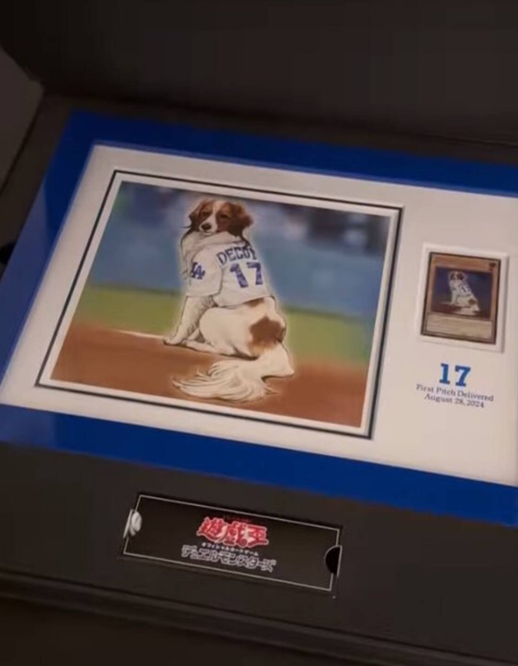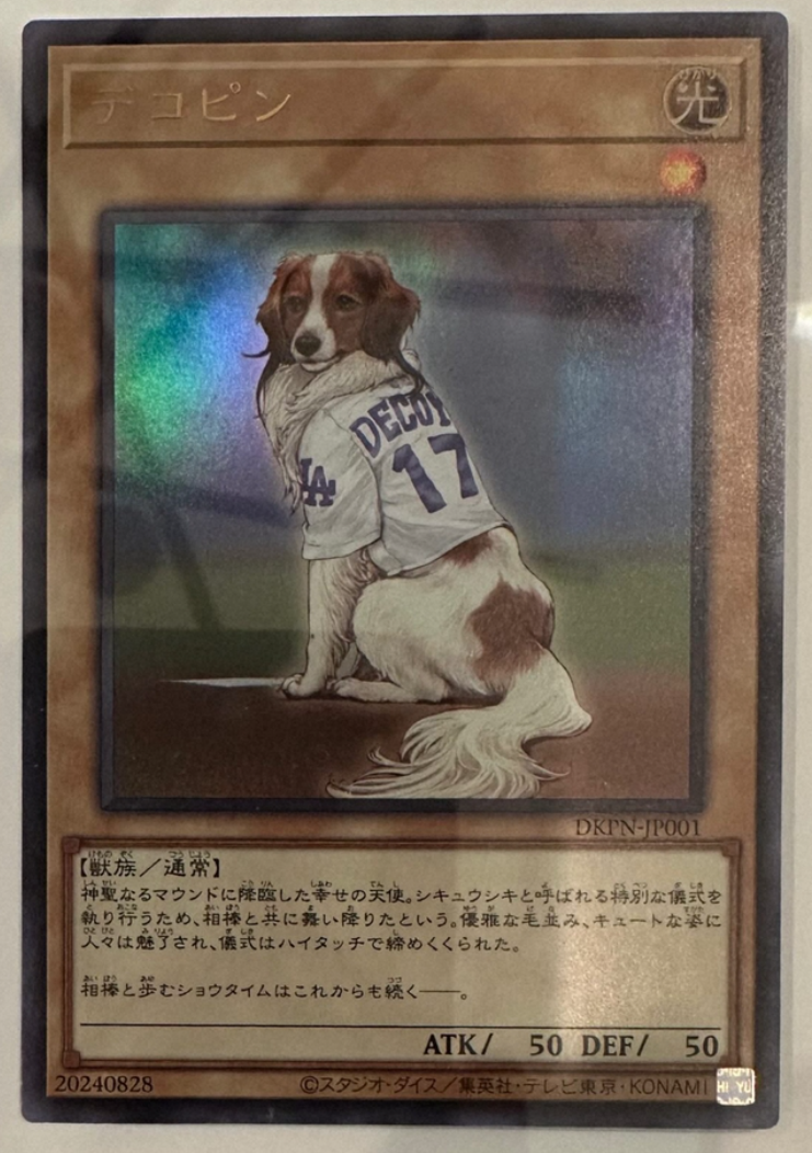 大谷在貼文中寫下:「遊戲王 x DECOY」,還加上漫畫《遊戲王》的經典台詞「#俺のターンドロー」作為 Hashtag,並分享了一段影片,內容是描繪他愛犬 DECOY 擔任開球嘉賓時的插畫,以及那張超有梗的遊戲王風格卡片。
