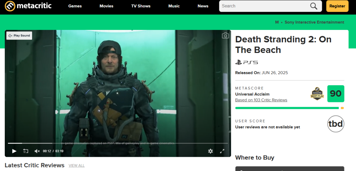由小島秀夫領軍開發、PlayStation 5 平台獨佔推出的《死亡擱淺》(デス・ストランディング)續作《死亡擱淺 2:冥灘之上》(デス・ストランディング2:オン・ザ・ビーチ),即將於 2025 年 6 月 26 日正式上市。隨著發售在即,本作在評分網站 Metacritic 上也搶先開出佳績,目前以平均 90 分的亮眼表現,交出一張精彩的成績單。