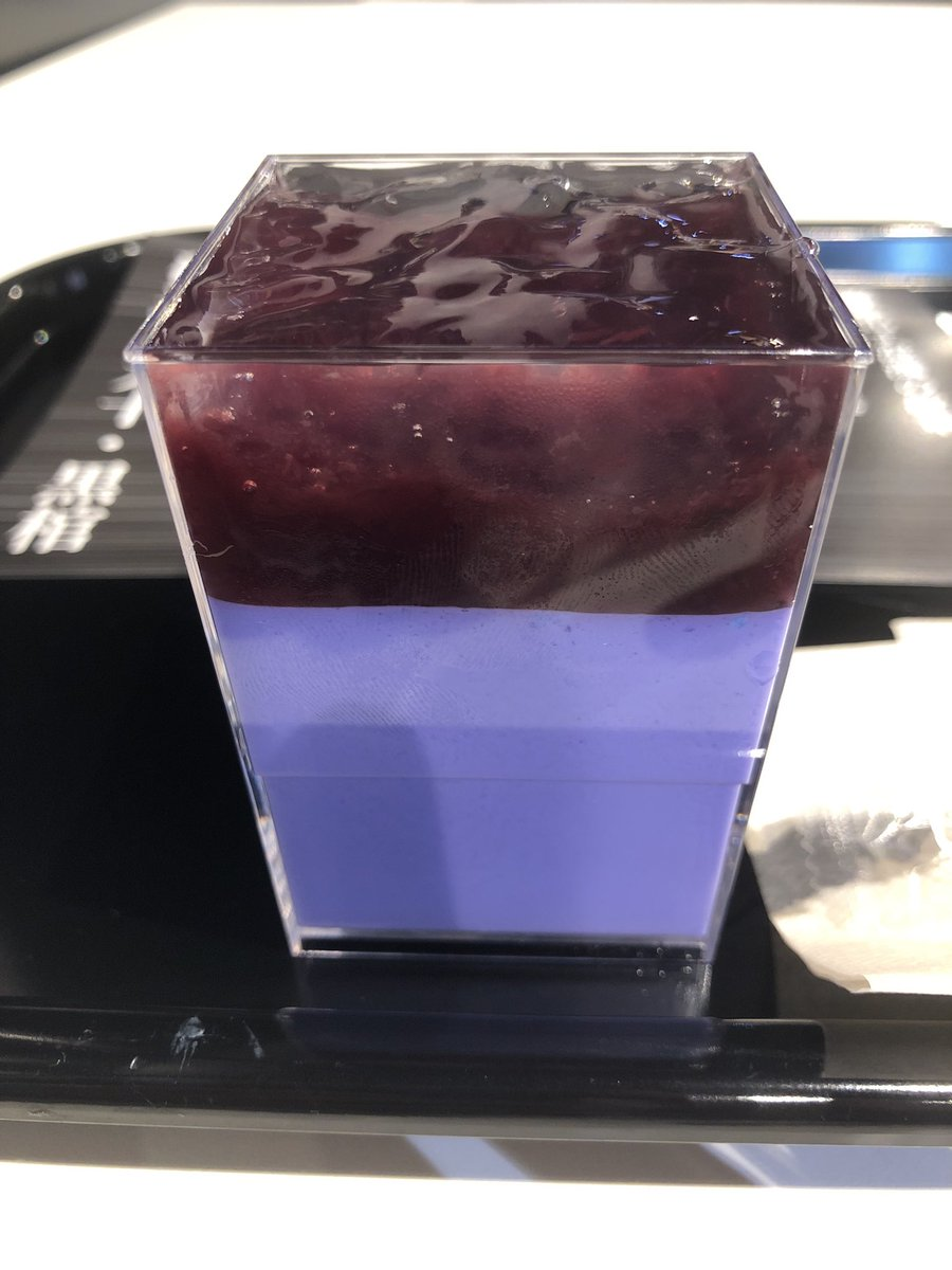 布丁本體則是用透明方形容器裝著,裡頭有紫色的牛奶布丁、透明果凍與藍莓醬,頂部還閃閃發光,整體看起來神祕又帶點詭異氛圍,彷彿隨時會釋放鬼道之力。