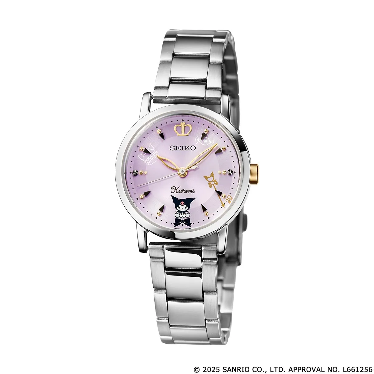 錶盤上還有一隻靜靜看著你的酷洛米,可以看到數字標記也改用酷洛米的耳朵來呈現,4 點鐘還藏了專屬酷洛米的小魔杖巧思,12 點鐘位置配上金光閃閃的皇冠,象徵 20 周年的榮耀時刻。