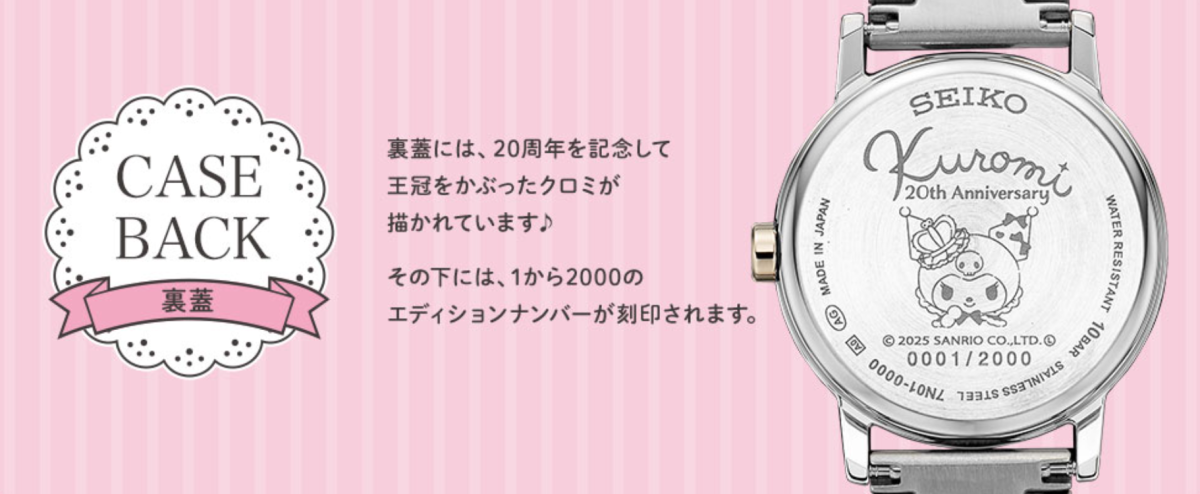 錶背則有戴上皇冠的酷洛米插圖,並標記 20 周年字樣,以及限量數字編號。
