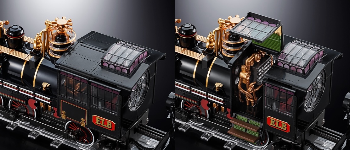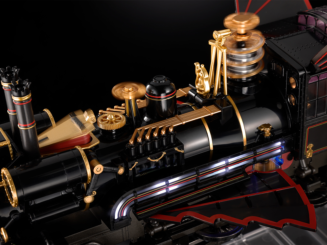 除了造型還原外這次的一大看點是時光火車會發光!會動!還會發出聲音!車體搭載有 56 顆 LED 燈泡,可以開啟再現電影中的發光效果,車身上具濃厚蒸氣龐克風格的零件皆採用電動馬達驅動設計,會透過齒輪裝置改變旋轉速度和方向,側面的白色車燈也採用繼電器控制,呼應電影中的設定,且蒸汽火車的排氣聲會根據火車的啟動同步響起!此外還將附贈馬蒂、珍妮佛、博士、克萊兒以及兩人的兩個小孩的迷你模型可以搭配擺設,簡直就是夢幻逸品!