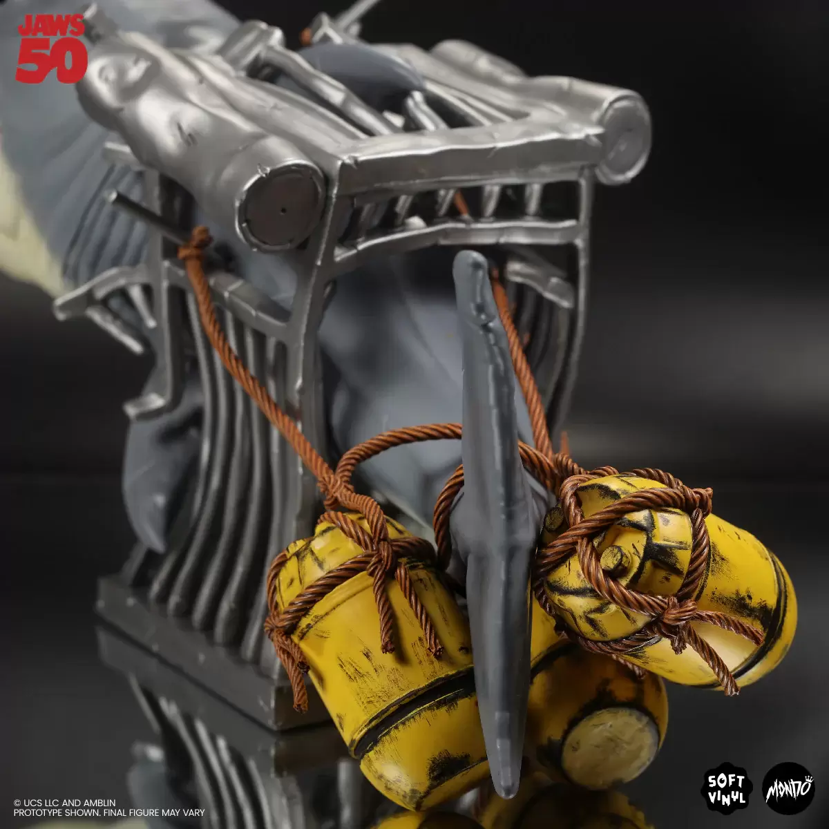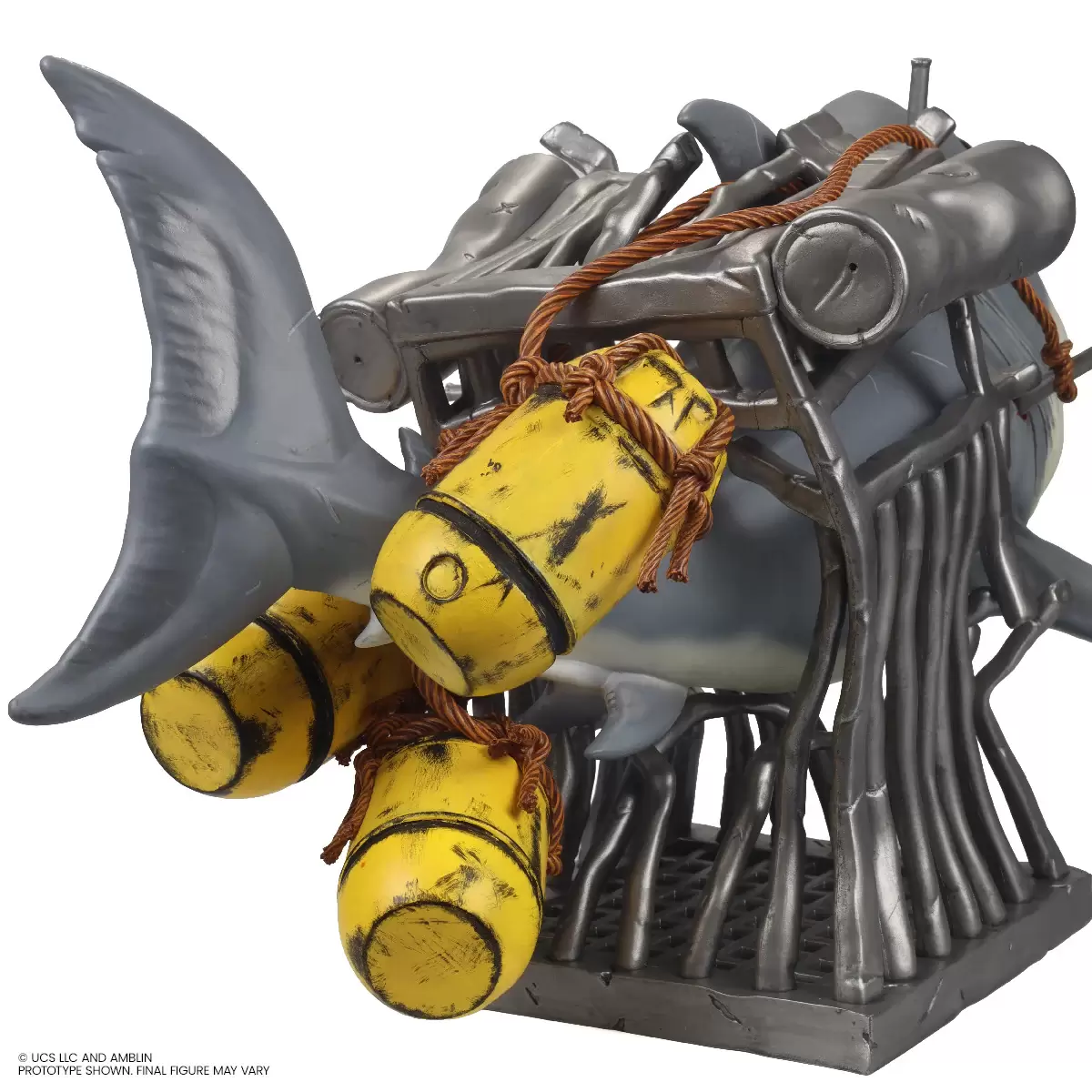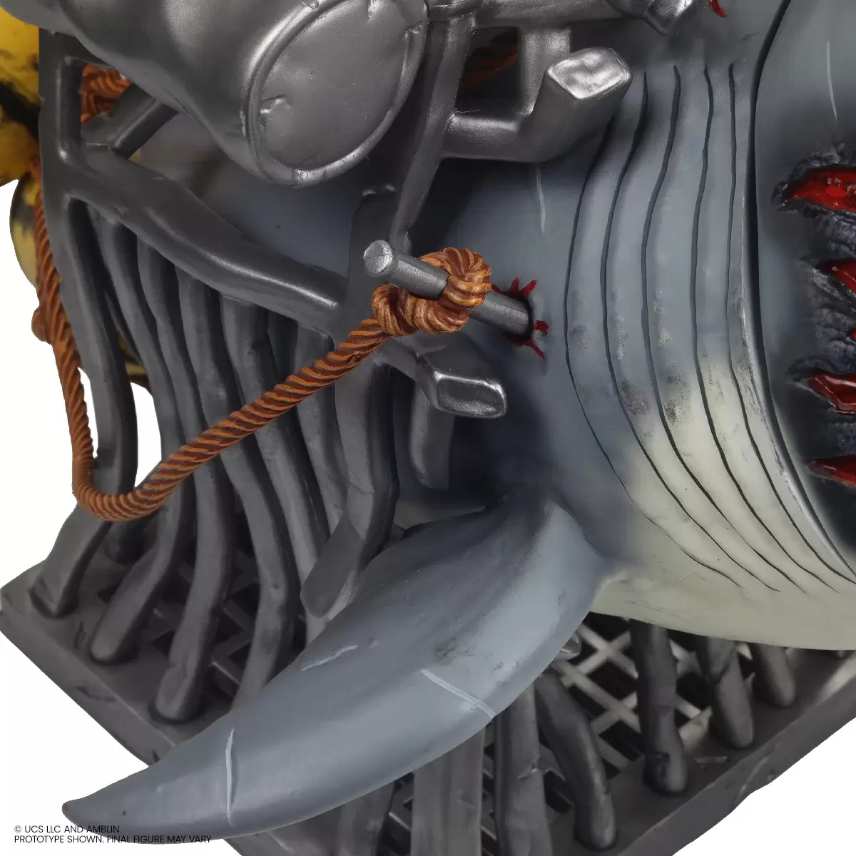 本作是由 James Groman、Brandon Gash、Hector Arce 三位藝術家進行設計、雕刻與塗裝,他們不單單以全長 16 吋(40.6 公分)的驚人存在感傳達出大白鯊布魯斯的威攝力,更注入許多經典的電影元素,是小編個人認為近期最讓人興奮的一款大白鯊收藏(當然,價格是也超級貴的)。光是布魯斯本體就刻畫出十分細膩的生物細節,加上佈滿俐齒、沾染鮮血的巨口跟全身上下大大小小的傷痕,完全可以感受到布魯斯在長久歲月中留下的戰鬥痕跡。