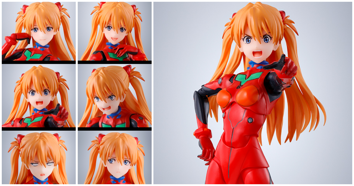 「S.H.Figuarts 式波·明日香·蘭格雷」可動人偶,尺寸約高 13.5 公分,以《福音戰士新劇場版:破》中還沒暫損(戴眼罩)的造型為基礎,醒目的紅色駕駛服緊緊包著纖細的身軀,在保持造型的同時注入靈活的可動結構:大腿內側與膝蓋能大幅度彎曲,即使是鴨子坐姿也能自然地擺出。除了標準臉部外,還附有 5 種可替換表情零件,包含經典的「安打八嘎(你是笨蛋嗎)」、怒視、生氣、臉紅等傲嬌場景都能再現!
