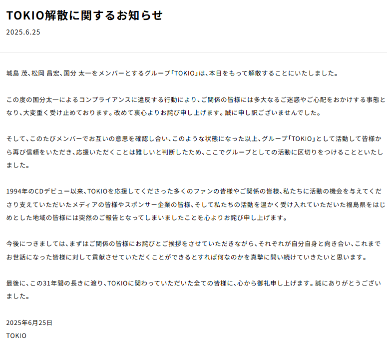 在以《關於TOKIO解散的說明》為題的公告中寫道:「由城島茂、松岡昌宏、國分太一三人組成的團體『TOKIO』,在今天正式解散。」