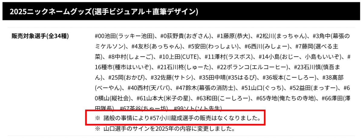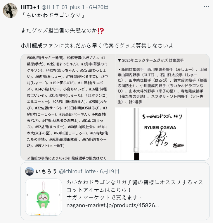 不過有球迷發現,今年羅德隊官網販售的綽號周邊商品中,小川龍成的商品顯示「由於各種因素的關係小川龍成選手的商品中止販賣」。這也讓球迷認為,似乎因為「ちいかわドラゴンズなり」這個綽號尚未跟吉伊卡哇談過,導致現在無法販售深怕有版權問題。