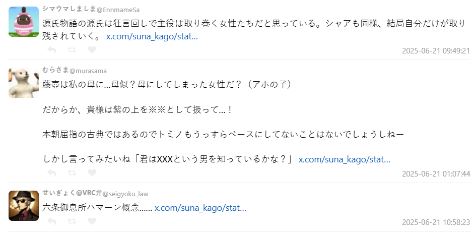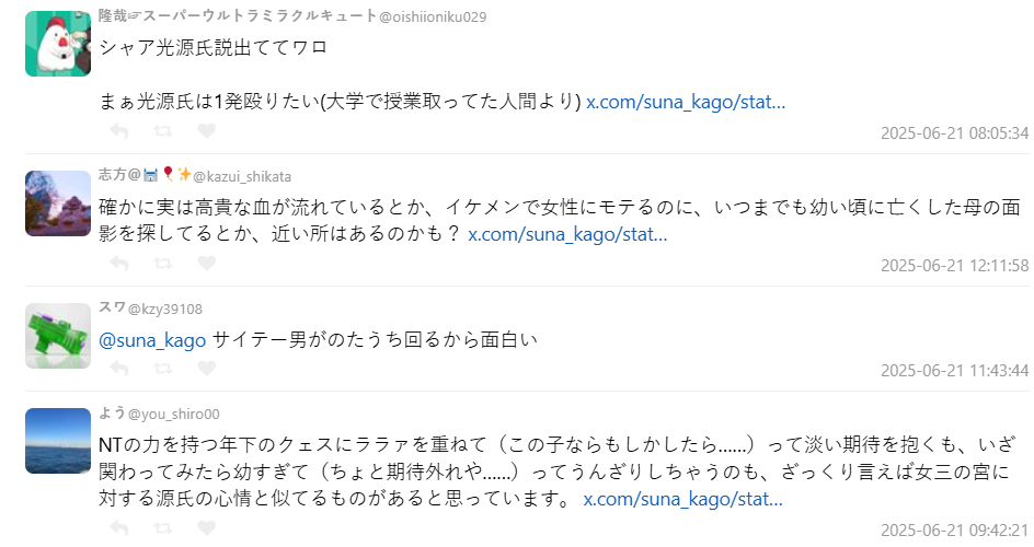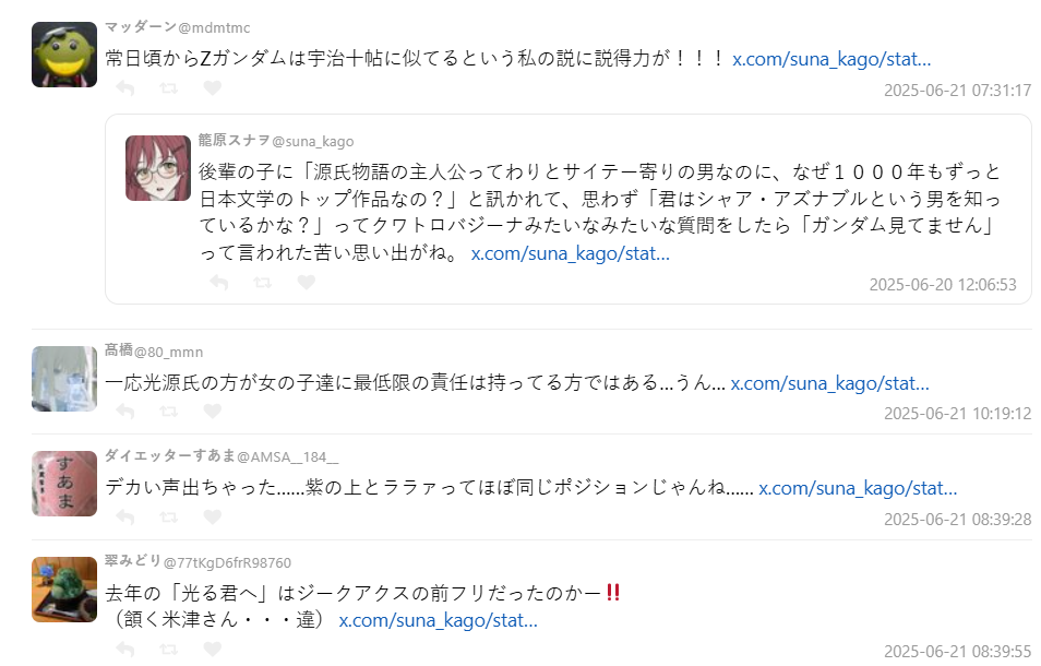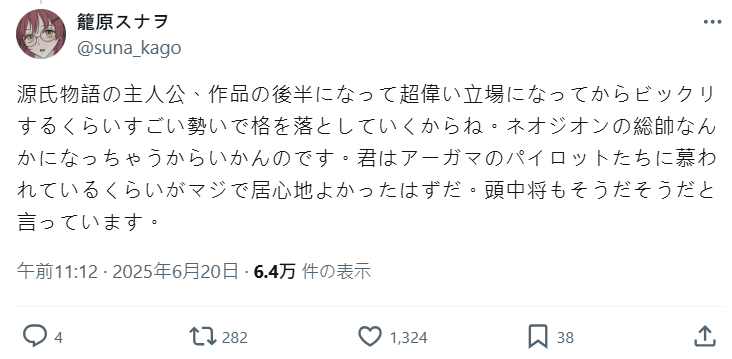 這番對比在網路上引發許多共鳴,網友們紛紛分享:「連沒看鋼彈的人都知道夏亞的名字」、「紫之上跟拉拉根本是同一個定位」、「六條御息所的執念讓我想到哈曼」。也有人指出:「其實主角是渣才有趣」「夏亞與光源氏一樣,被女性角色圍繞卻始終孤獨」。