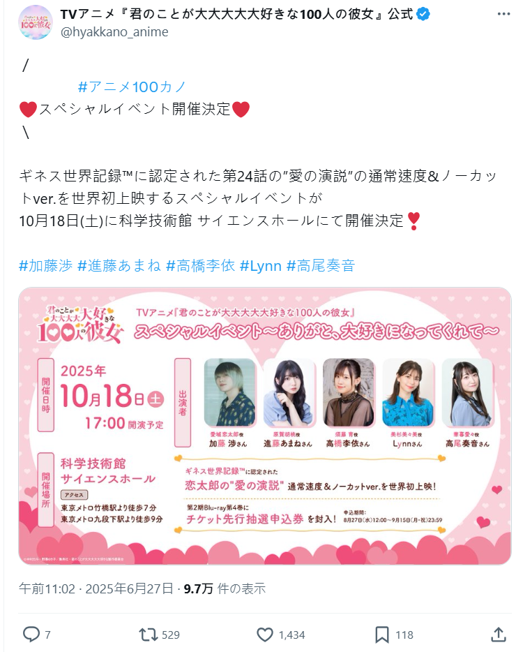 此外,官方也預告將於 10 月 18 舉辦特別活動,除了邀請主要聲優登台舉辦Talk Show外,還將首次在現場放映這段第 24 集中創紀錄的「愛的演說」完整版(正常語速、無剪輯版)!