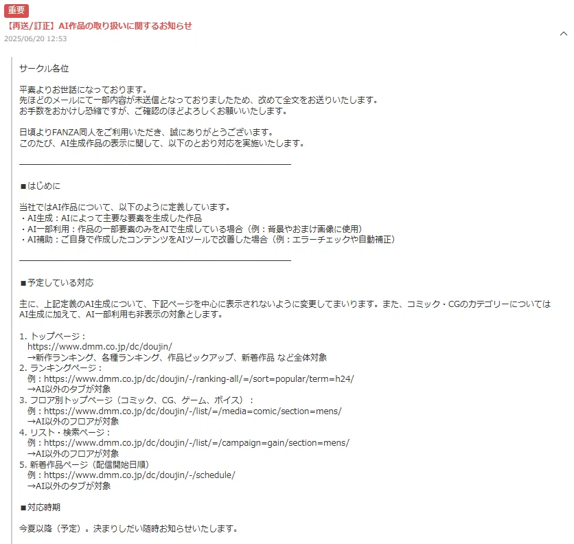 根據 FANZA 公告指出,未來將把 AI 相關作品分為三類:「AI生成」、「AI一部使用」與「AI輔助」,其中「AI生成」類別的作品將從首頁、排行榜、精選區與新作頁面等主要曝光管道中被移除。部分類別如漫畫與 CG 作品,更連「AI一部使用」的作品也一併排除在主展示之外。
