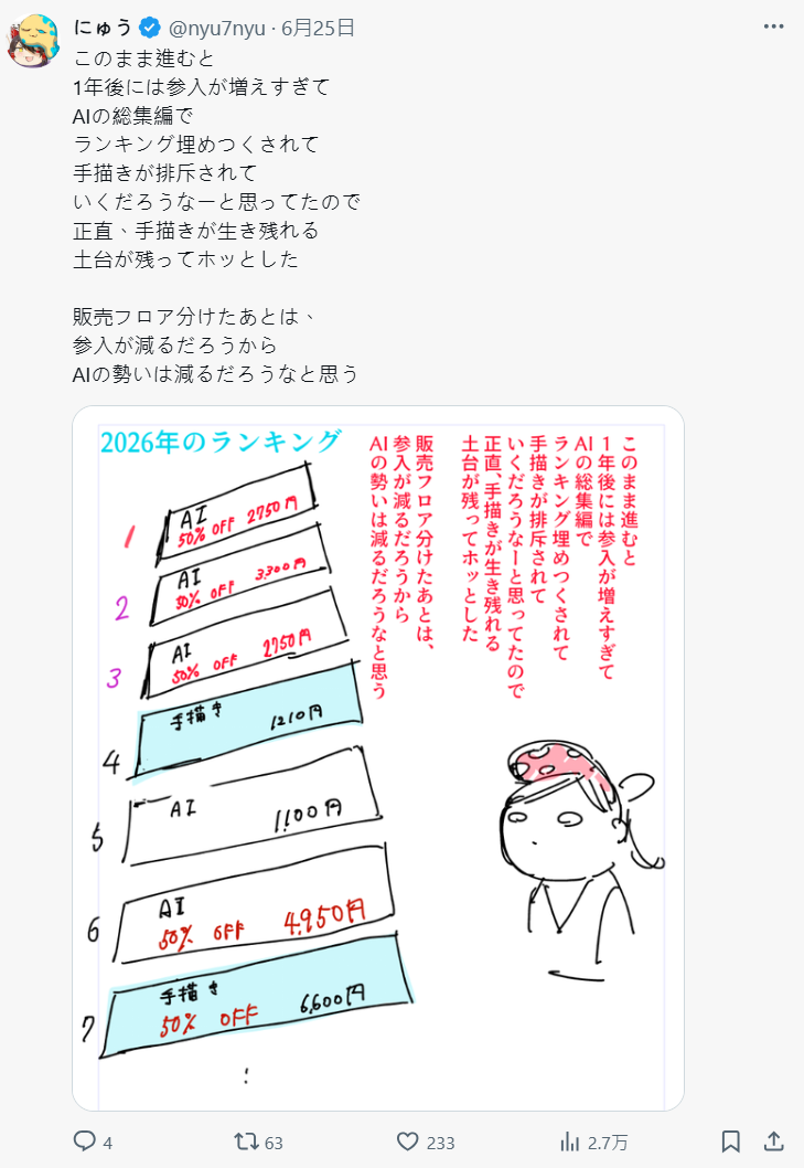 不少採用手繪的繪師創作者們也紛紛表達看法,繪師「にゅう」在社群平台表示,自己早就預料AI創作會在一年內淹沒手繪作品排行榜,如今平台做出區隔,讓手繪創作者能保有生存空間,他坦言感到「鬆一口氣」。他並預期,一旦販售區域被切割,AI社團的進入門檻將提高,產量也會減緩。