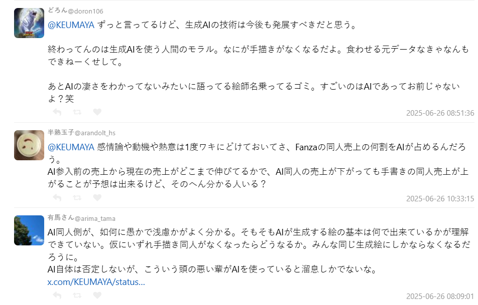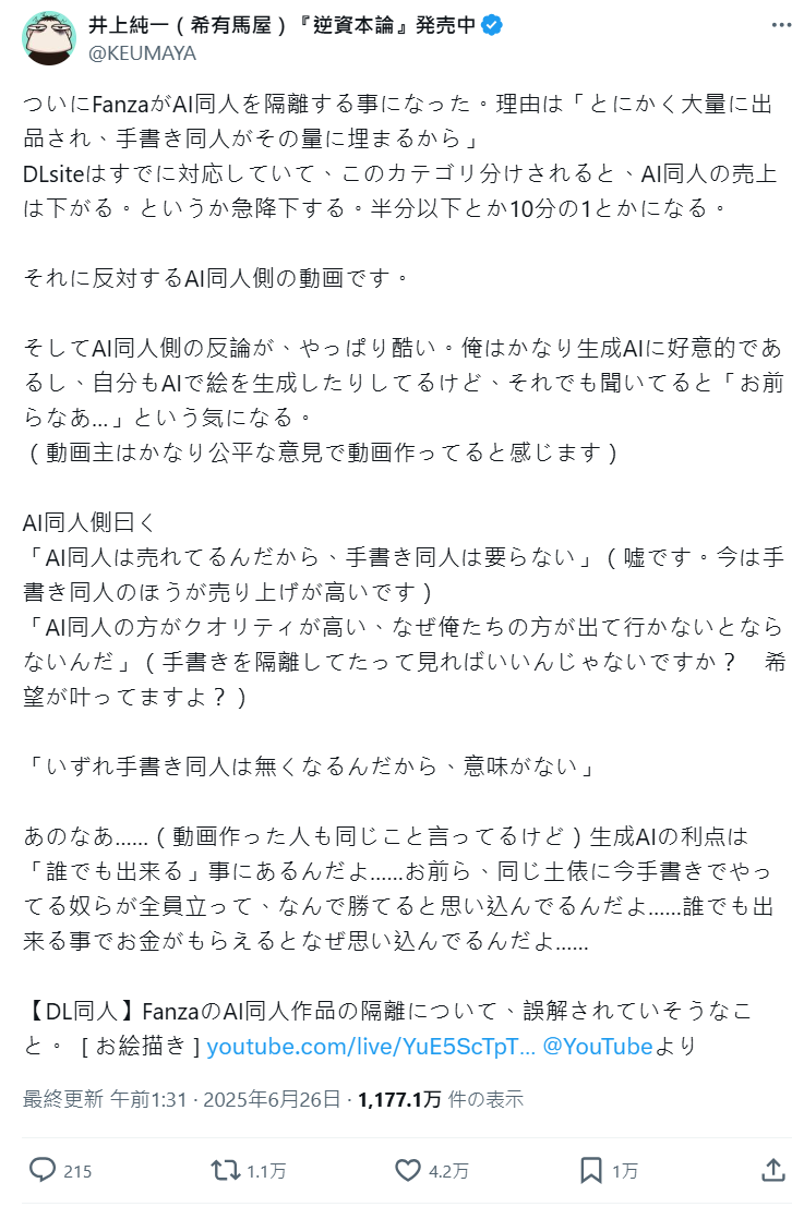 漫畫家希有馬屋 ( 井上純一 ) 也針對此事件發表評論,他表示,FANZA 此次之所以動作,是因為 AI 作品「投稿數量過多、品質卻參差不齊」,導致手繪同人被掩蓋。他舉例,DLsite 早已進行分類,結果是AI同人作品銷售「暴跌到原本的一半甚至十分之一」。