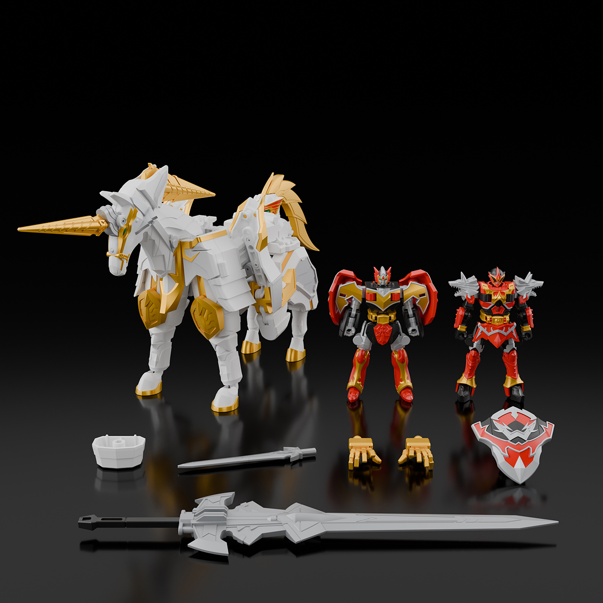 此外商品還能與另售的「SMP 黑狼凱薩」連動,讓神聖魔法鳳凰、魔導騎士烏薩德、尤尼肯恩、巴力基翁四機交換合體,再現當年 DX 玩具的原創合體形態。