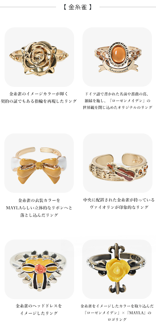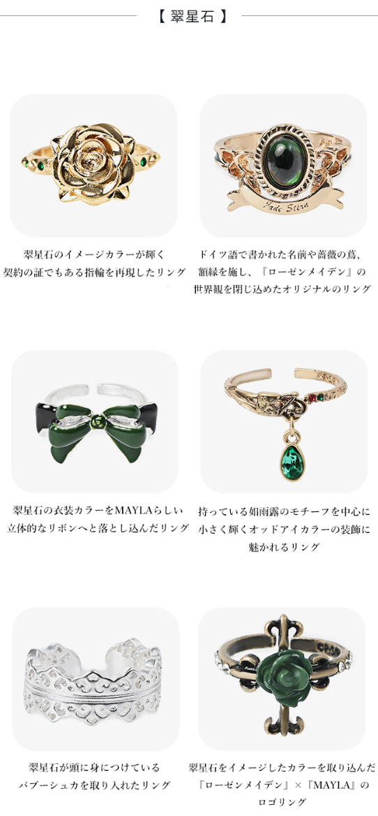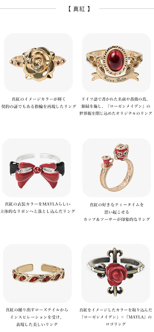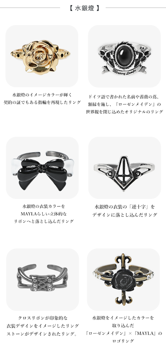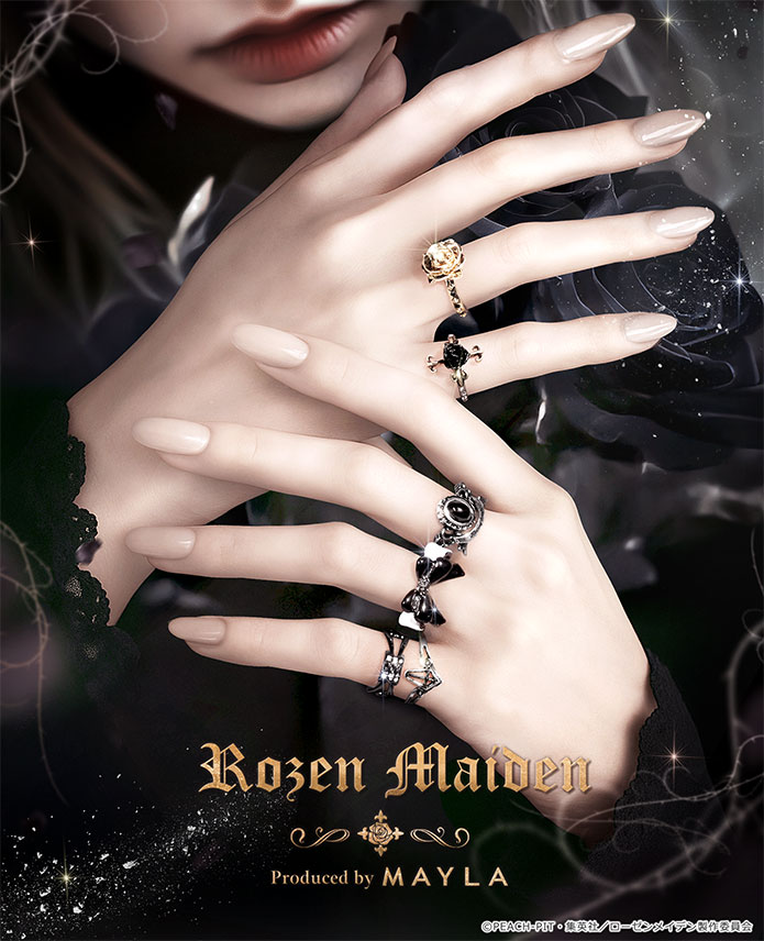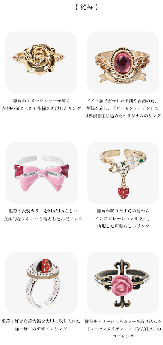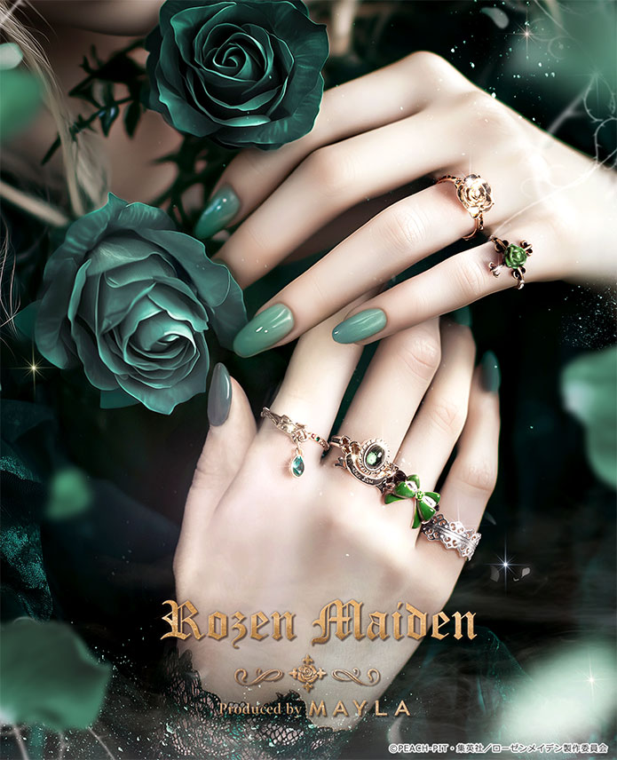 近日宣布繼先前聯名真紅&水銀燈主題成套洋裝 & 角色主題髮簪,再次與 PEACH-PIT 創作的漫畫《薔薇少女》合作,推出以七位女角色為主題的形象戒指組。售價為 22,000 日圓,目前已可在官網訂購。