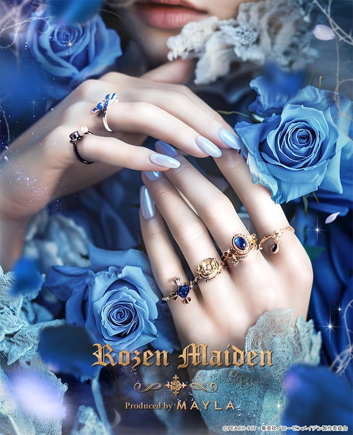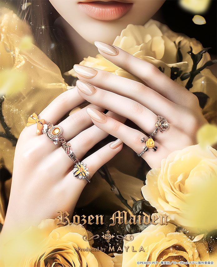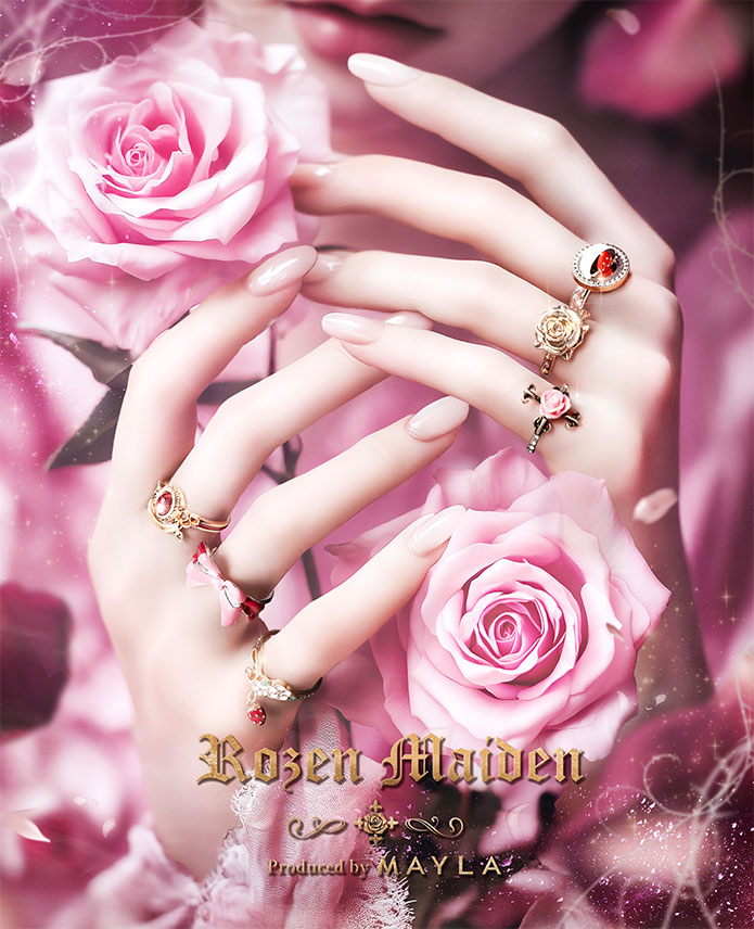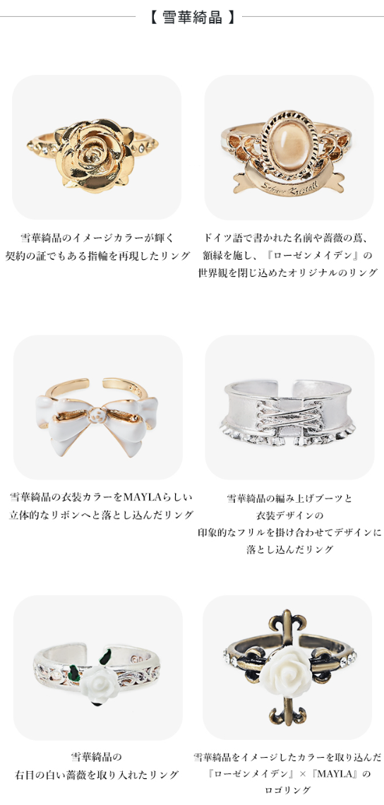 這次合作推出七位角色的形象戒指組,包含 : 水銀燈、金絲雀、翠星石、蒼星石、真紅、雛莓、雪華綺晶,所有薔薇少女系列七大人偶都一次推出。