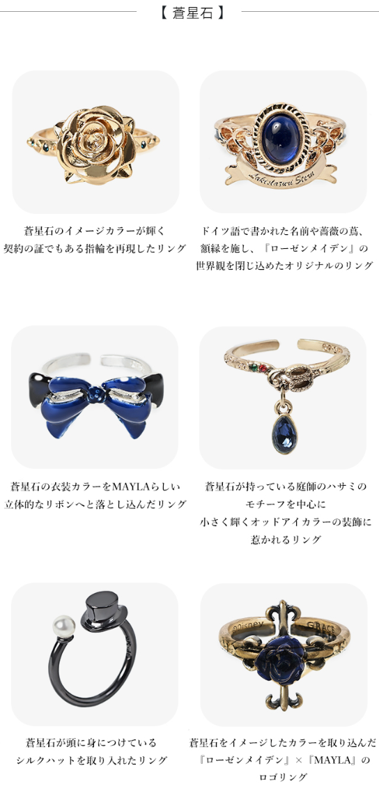 設計上採用各人偶設定的服裝與色系當作設計主軸,還用上人偶的發條來打造,並點綴各角色的所代表的薔薇「契約證明」。每一個組合共有六款戒指,可以隨心所欲讓你日常搭配使用,隨心情選擇哪一款甚至混搭。讓你各位推哪個都有得入手,當然全推就...一次買齊吧 XD。