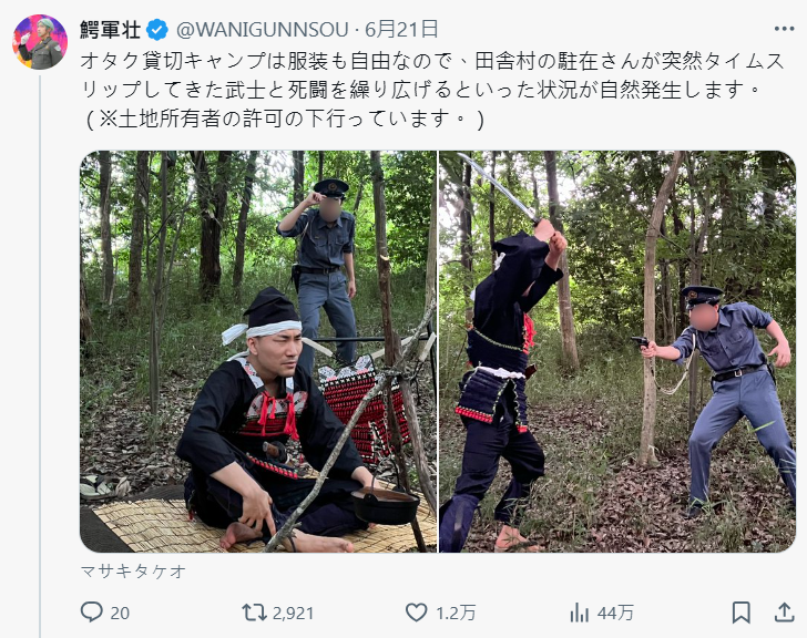引起討論的推主鰐軍壯(@WANIGUNNSOU)發文表示,自己一抵達這所謂「御宅族包場露營」現場就被眼前的畫面震撼到笑出來,原以為是普通露營,沒想到一看就是穿上「武士」的參與者,到底是怎麼回事。