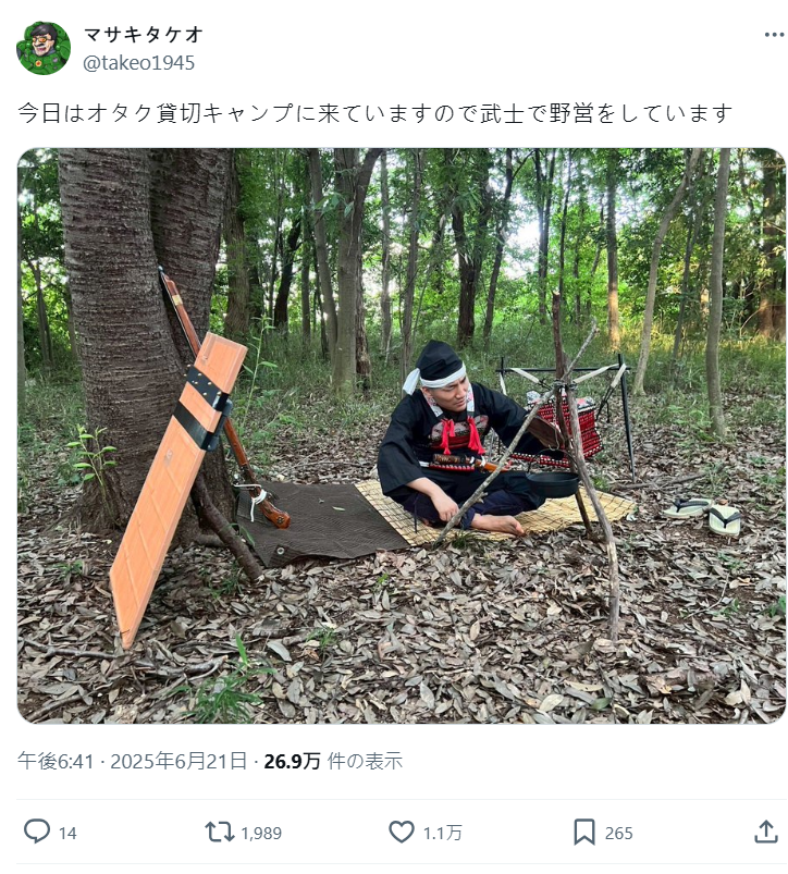 參加者マサキタケオ(@takeo1945)穿上完整的武士裝扮搭帳棚,引起熱議。有網友笑稱:「根本不是露營,是行軍中的野營吧」、「還以為誤闖時代劇拍攝現場」。