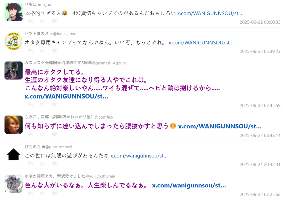 對此活動,不少網友紛紛留言表示羨慕:「這太好玩了,我也想參加」、「這是我夢想中的露營啊!」、「完全是宅宅的天堂」、「光想到可以跟一群喜歡同樣作品的人同樂,感覺真的很有趣!」