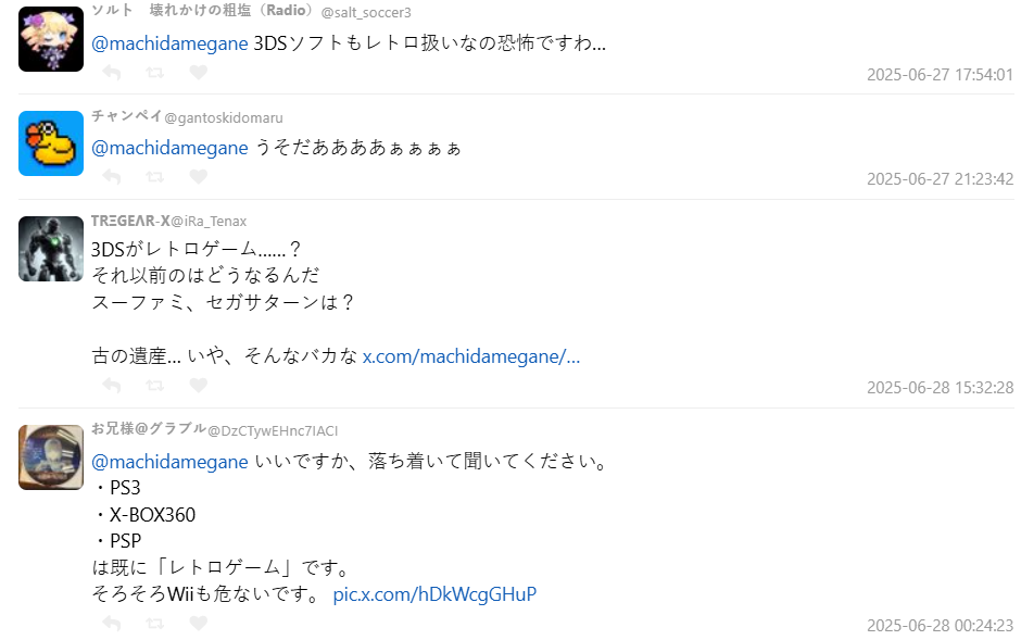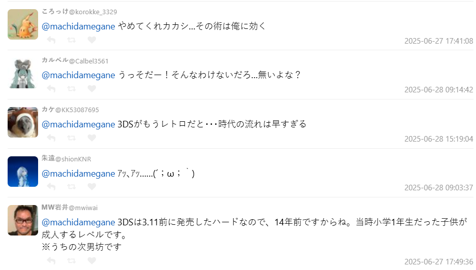Po 文的推主町田メガネ(@machidamegane)也向網友提出困惑,現在已經是3DS會被列入「復古遊戲」的時代了嗎,在 X 上引起關注後,瞬間引發大量玩家共鳴與哀嚎。