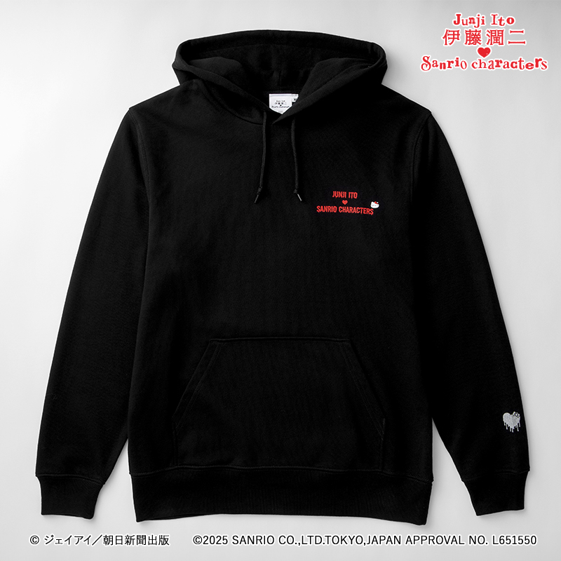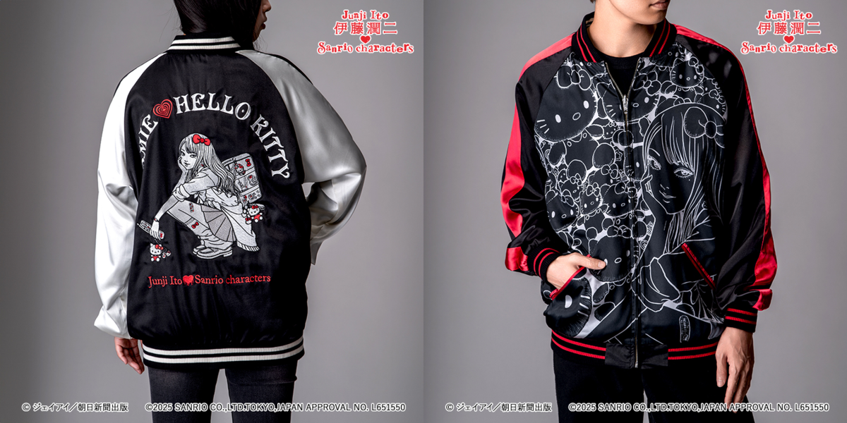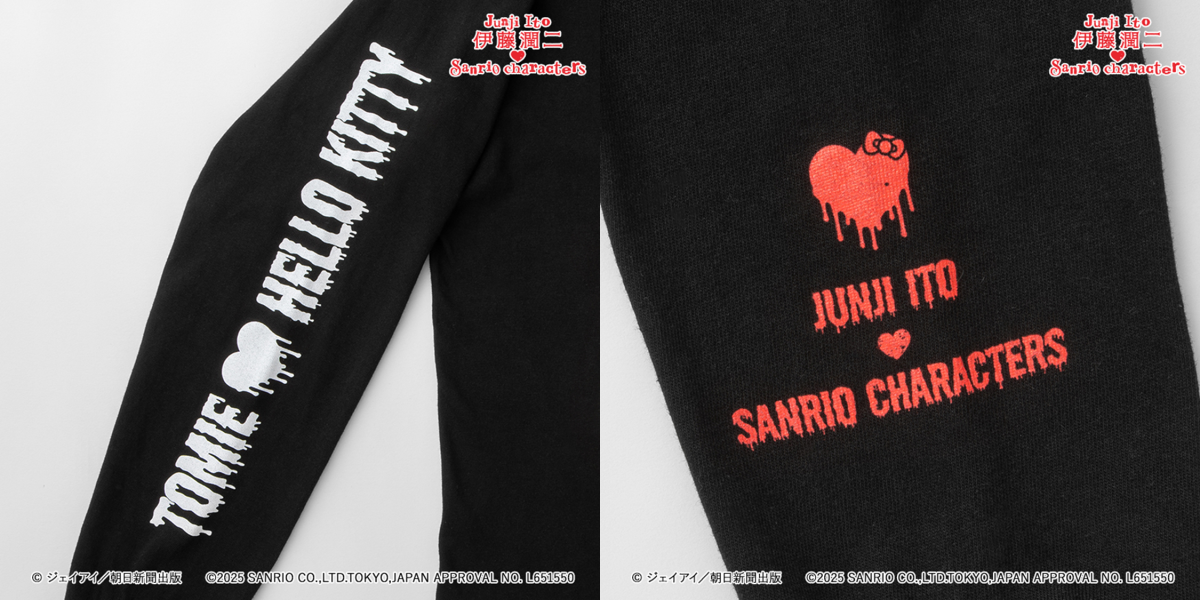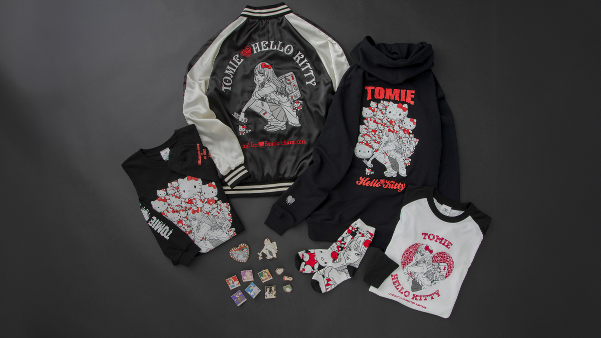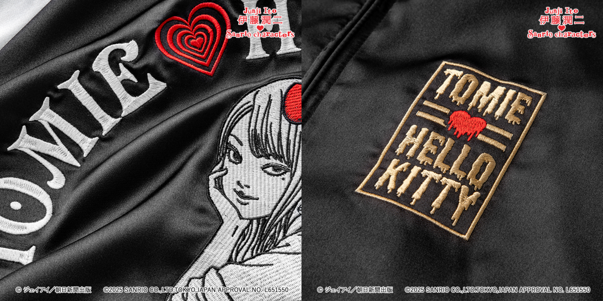 這波聯名主打兩大人氣系列:「辣妹富江」以及以伊藤潤二角色模仿三麗鷗角色為概念的「まねっこ」系列。商品內容超多元,從時尚的橫須賀刺繡外套、帽T、七分袖的棒球T,到襪子、小別針等配件通通包辦,整體風格走的是潮流混搭恐怖的另類美學!