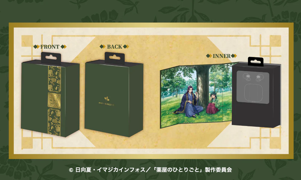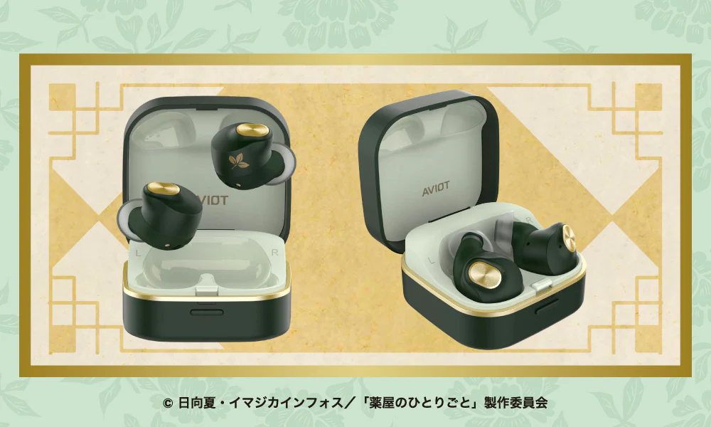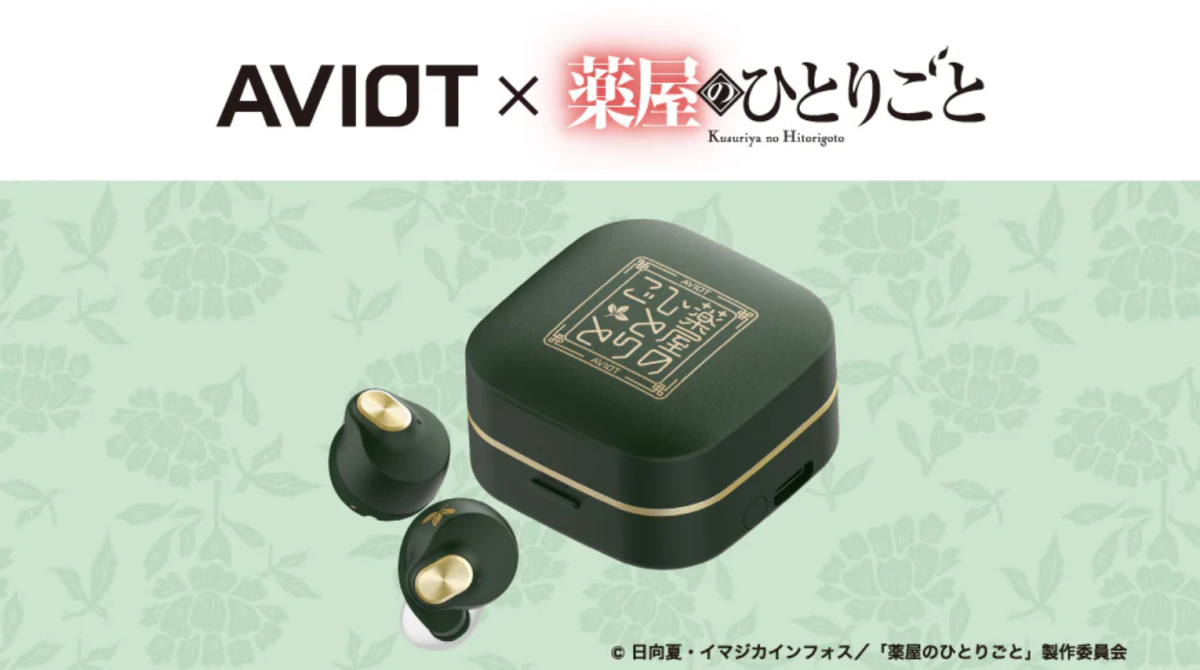 這款聯名耳機以 AVIOT 的人氣機種「TE-Q3」為基礎,耳機和充電盒配色選用橄欖綠搭配金色,整體質感超高,再加上以藥草為靈感的 LOGO 設計,滿滿都是《藥師少女的獨語》的世界觀。