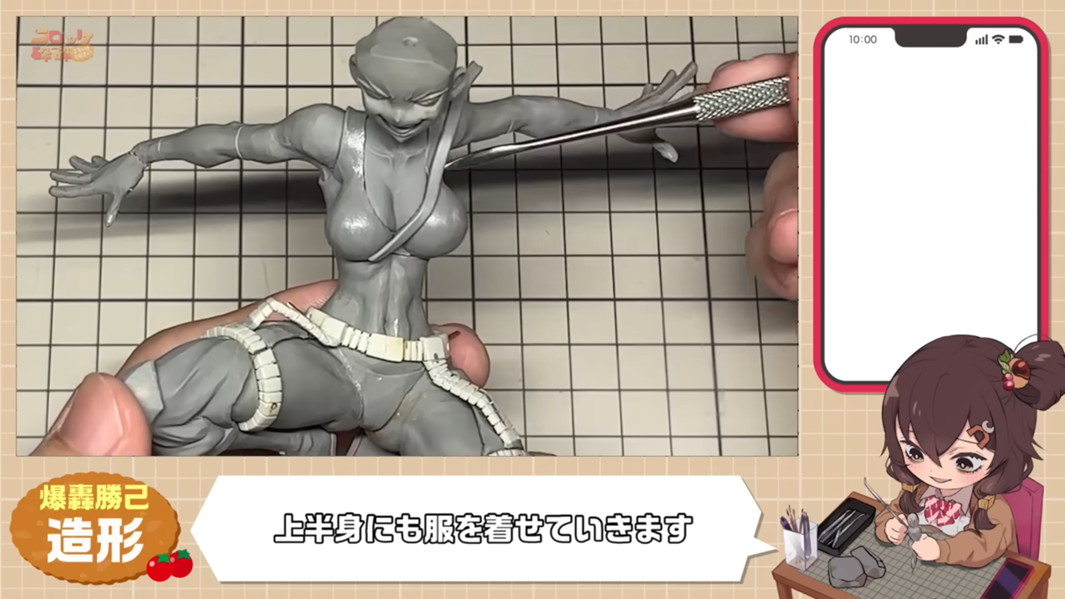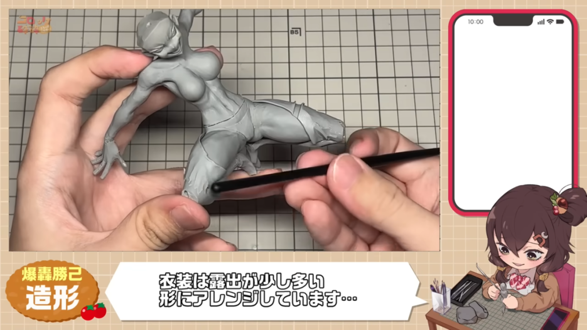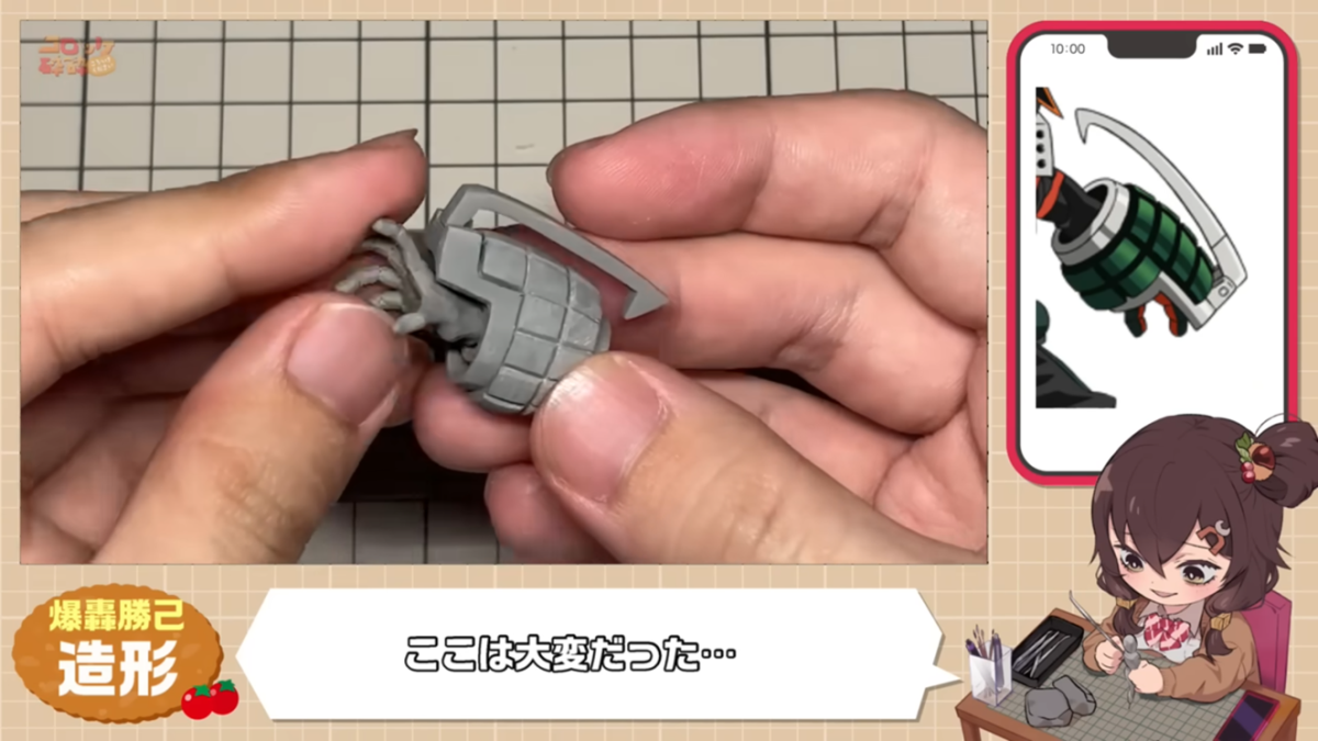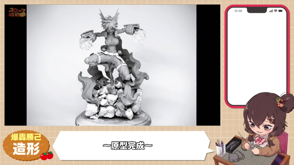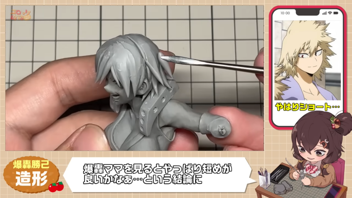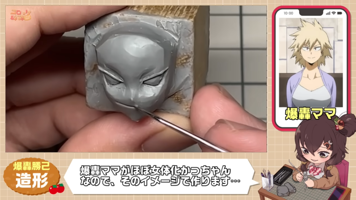 一樣透過黏土與鐵絲來捏出人形,從基礎的頭部製作起步,コロッケ砕砕表示,因為爆豪在官方可以參考「女體化」的範本,就是爆豪媽媽以及作者堀越耕平畫過的性轉版本,想說要把身材強調出來,在搭配爆豪招牌的自負神韻,當然爾還是必定要捏個巨乳了 ( ? )