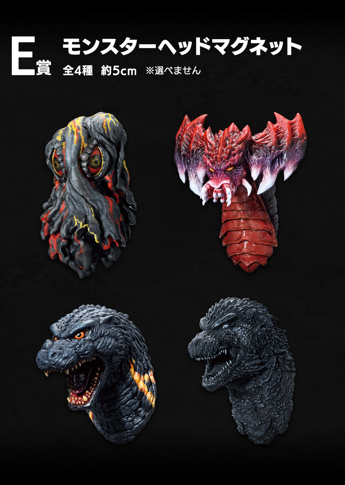 B、C、D 三賞為高品質的 MONSTERLISE 系列怪獸模型,分別是《正宗哥吉拉》中的哥吉拉(2016)、《哥吉拉vs太空哥吉拉》中的太空哥吉拉以及《哥吉拉對機械哥吉拉》中的機械哥吉拉(1974),在 18 公分的尺寸下細膩的捕捉怪獸們在銀幕上的模樣,並塗裝再現精緻的造型細節!而 E 賞則再次推出了大人氣的怪獸頭雕磁鐵,這次收錄黑多拉、戴斯特洛伊亞的集合體、紅蓮哥吉拉以及正宗哥四種款式!詳細賞品資訊待日後公開,已經讓人迫不及待想開抽了啊!
