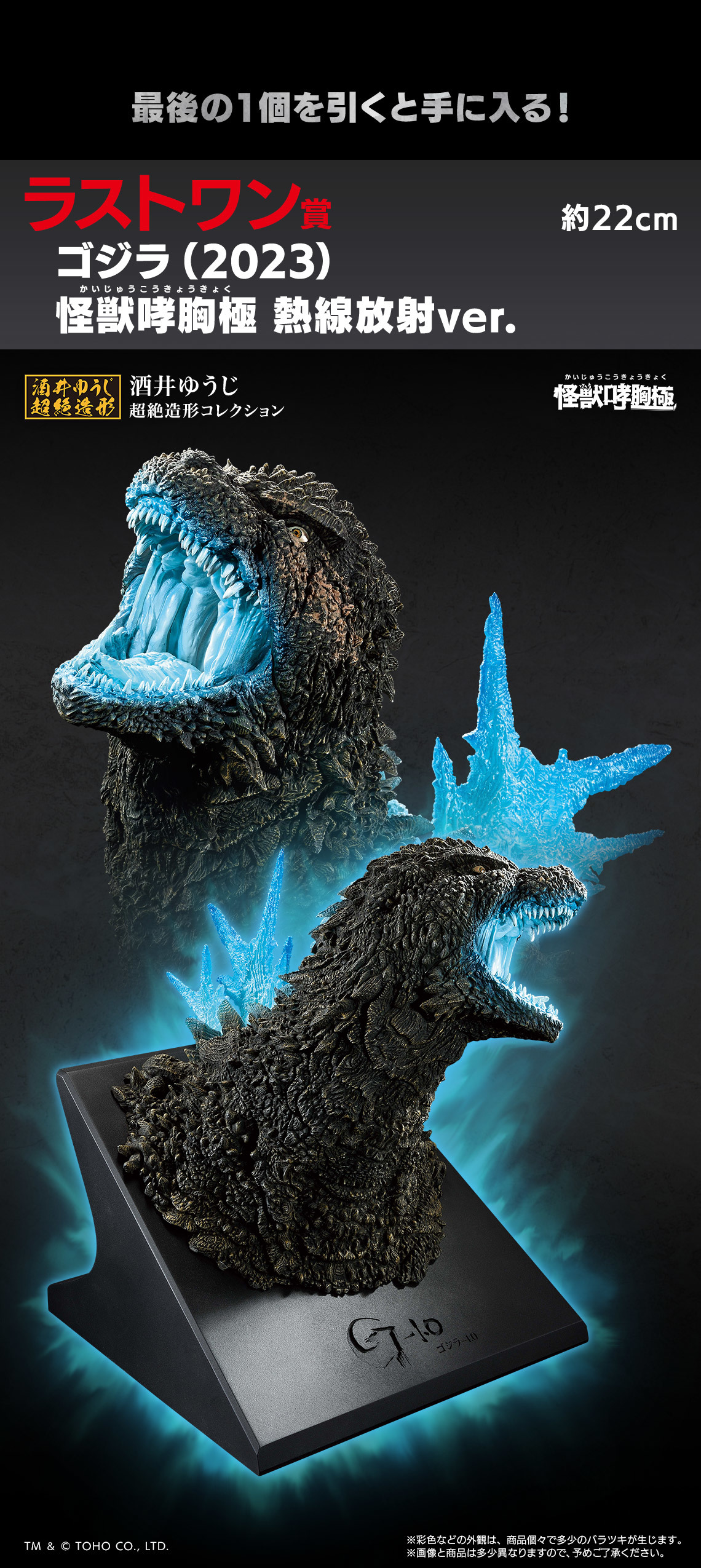 本次的「哥吉拉 怪獸亂舞 -狂暴之物-」提供 A~H、最後一賞與雙重中獎賞等不同級別的賞品!目前搶先公開的 A 賞為由人氣怪獸原型師酒井裕司老師打造的全新胸像系列「怪獸咆哮胸極」的哥吉拉(2023),細膩雕刻重現負一哥頭部的造型細節,臉上被水雷炸傷後癒合的疤痕、粗糙的表皮紋理與駭人的血盆大口都被精緻還原!最後一賞則是哥吉拉(2023)怪獸咆哮胸極的放射熱線 Ver.,以精緻的塗裝在 A 賞的基礎上再現負一哥在電影中準備釋放放射熱線的魄力姿態!