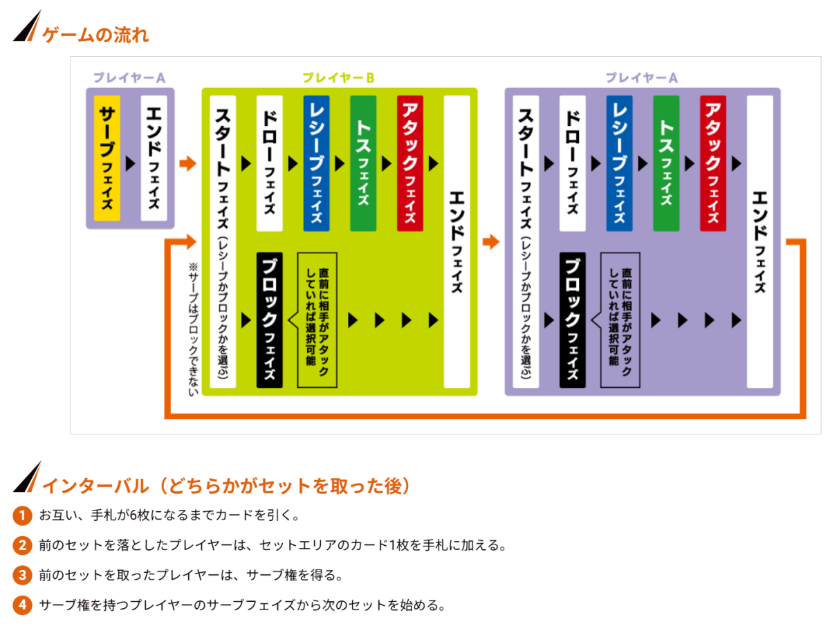 遊戲流程仿照真實排球比賽,從發球開始,輪流在「接球區」、「舉球區」、「扣球區」放置角色卡來進行攻防,就像實際打排球一樣拼命救球、傳球與進攻!
