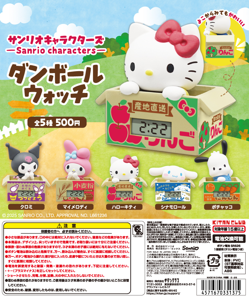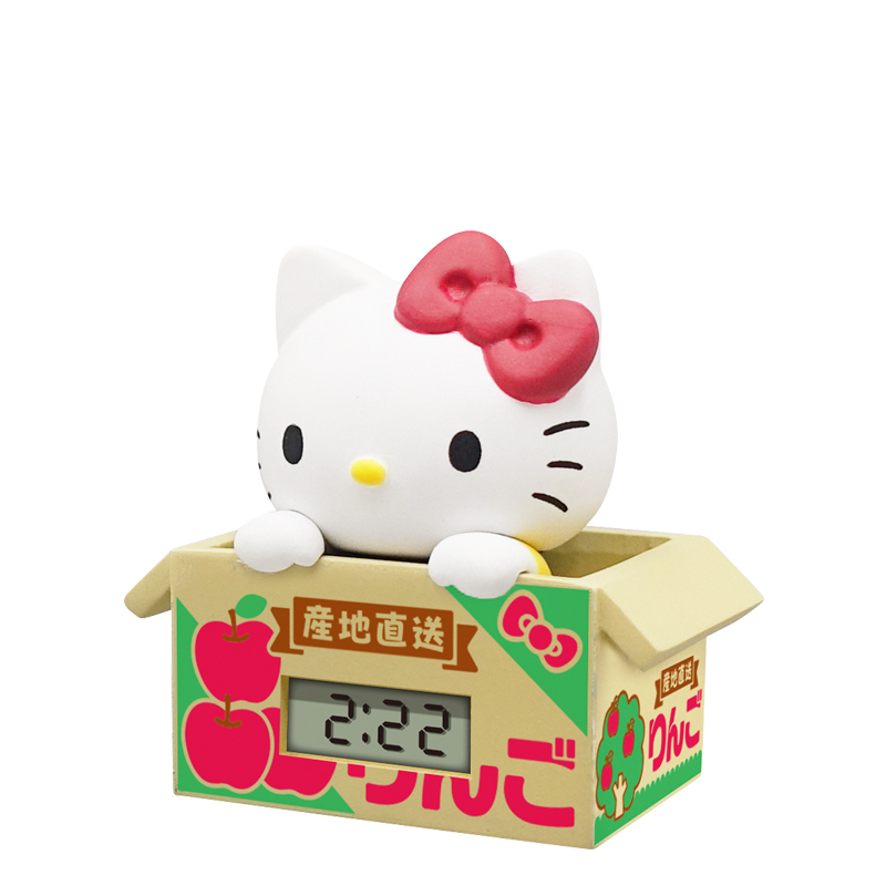 本次的「三麗鷗明星 紙箱造型時鐘」為三麗鷗明星打造了被裝在農作物箱子裡的造型,製作成高約 3~5 公分的迷你造型時鐘,收錄 Hello Kitty、美樂蒂、庫洛米、大耳狗及帕恰狗共五種款式,紙箱採用奇譚俱樂部的原創設計,融入了各角色喜歡的食物與興趣等元素,活潑的動態搭配紙箱上有趣的印刷讓人難以抗拒!而時鐘底部設有按鈕,可以切換「日期顯示」與「秒數顯示」功能,還可以更換電池,讓三麗鷗明星們能夠長久的為各位玩具人報時!