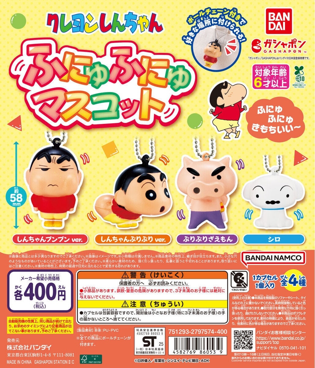 萬代公司轉蛋事業部 GASHAPON 推出以國民動畫《蠟筆小新》為主題的新商品——「蠟筆小新 軟綿綿角色吊飾」轉蛋,參考售價為每轉 400 日圓,預計於 2025 年 07 月第三週發售!