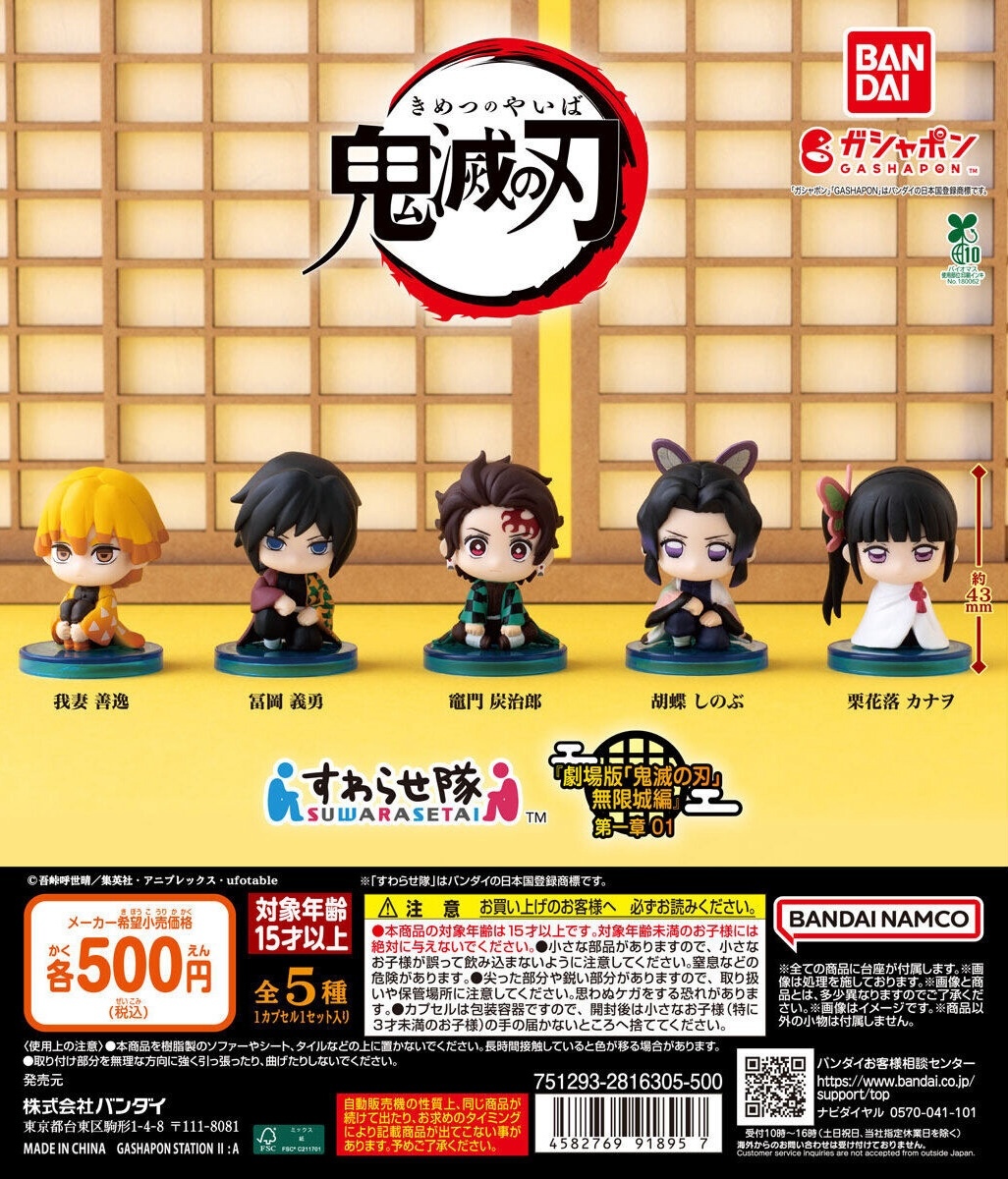 萬代公司轉蛋事業部 GASHAPON 旗下以坐姿勢為造型的「坐下隊」(すわらせ隊)系列推出人氣動漫《鬼滅之刃》主題的新商品——「坐下隊《鬼滅之刃劇場版無限城篇》第一章 01」轉蛋,參考售價為每轉 500 日圓,預計於 2025 年 07 月第四週發售!