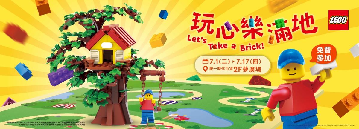 「玩心樂滿地」第一站即日起至7月17日於統一時代百貨台北店2樓夢廣場登場!台灣樂高®打造巨型樹洞闖關體驗與三大體驗關卡,邀請大小朋友發揮觀察力、想像力、創造力輕鬆玩樂,走進「紓壓樂森活」,用樂高拼出指尖陀螺,放鬆療瘉紓壓;接著進入「玩轉溜溜球」關卡,隨著手中溜溜球的上下次數,在彈跳床上蹦蹦跳跳放電趣;最後步入「共創好森林」發揮想像力,拼砌出森林中奇幻生物,共創樂高森林。完成關卡挑戰即可獲得「樂高®經典 2×4 積木包」,享受樂高拼砌樂趣,放膽拼出九萬多種可能!